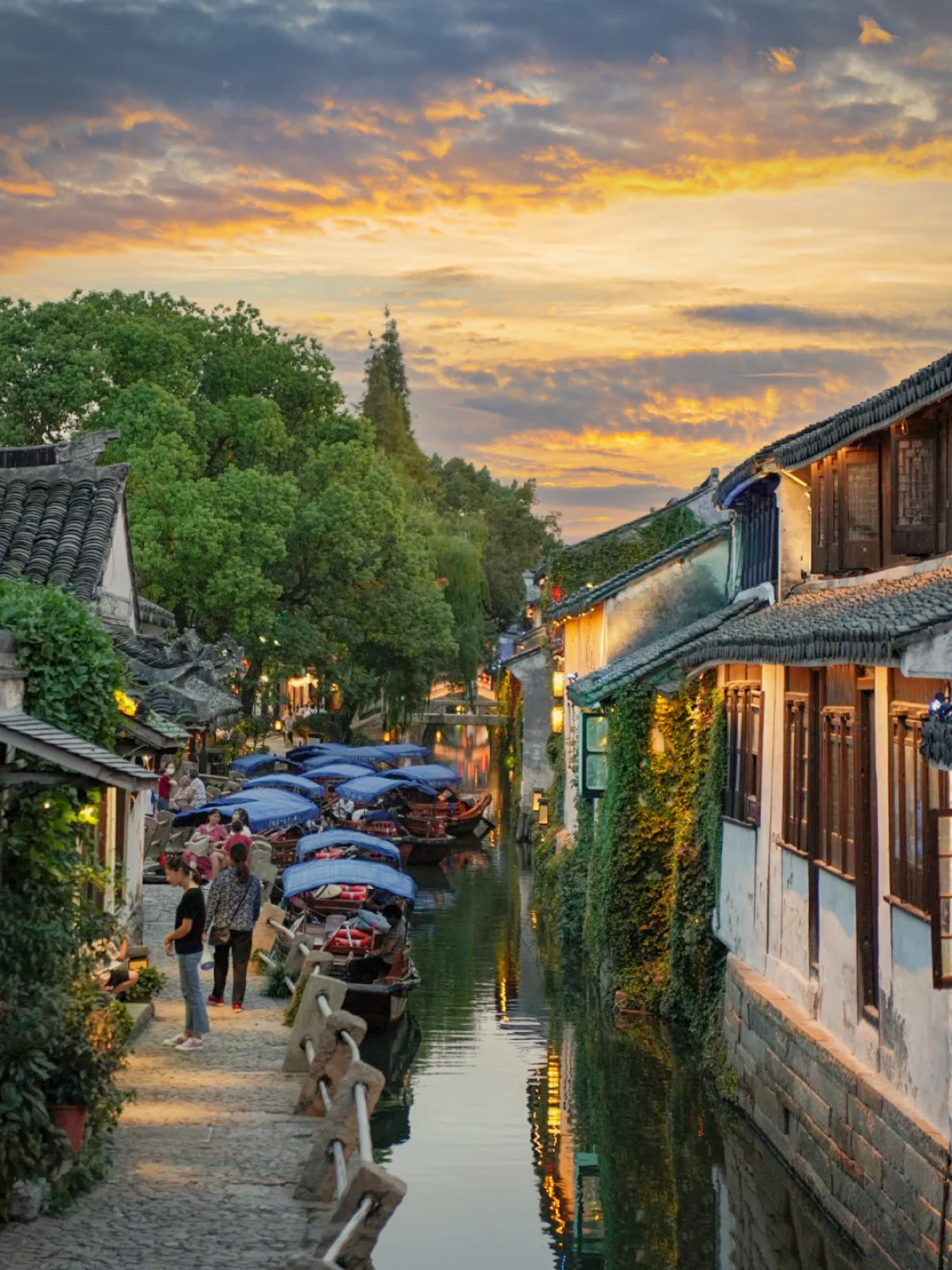 白天:小桥流水、青石板路、乌篷船摇橹…经典的江南水乡韵味。双桥、沈厅、张厅必逛,坐在河边喝杯阿婆茶,惬意得很🫖