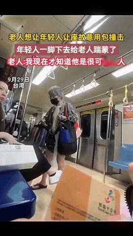 9月29日台湾,在地铁上发生了让不让座! 一老人想要年轻的女子让座, 却用包故意撞击女子,女子把东西给同伴拿着, 起来一脚下去把老人踹懵了! 说真的,这视频看到对面还有座位的呀! 为什么不坐呢?却跟女子在这里较劲? 老人说我现在才知道有一些年轻人火气很大。 老人最后走了? 叫人家让座,不应该强迫吧? 毕竟现在年轻人上班也很累的。 你说该怎么让座才好?