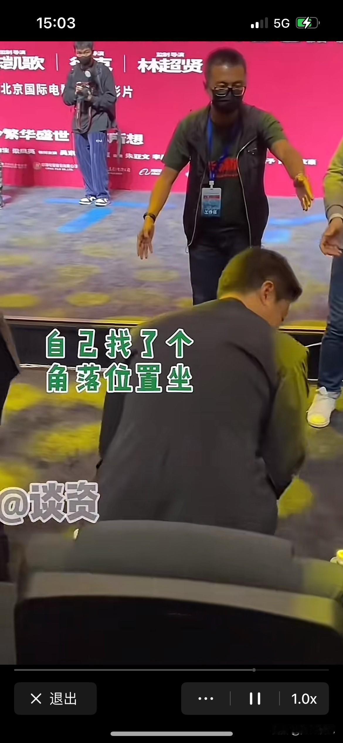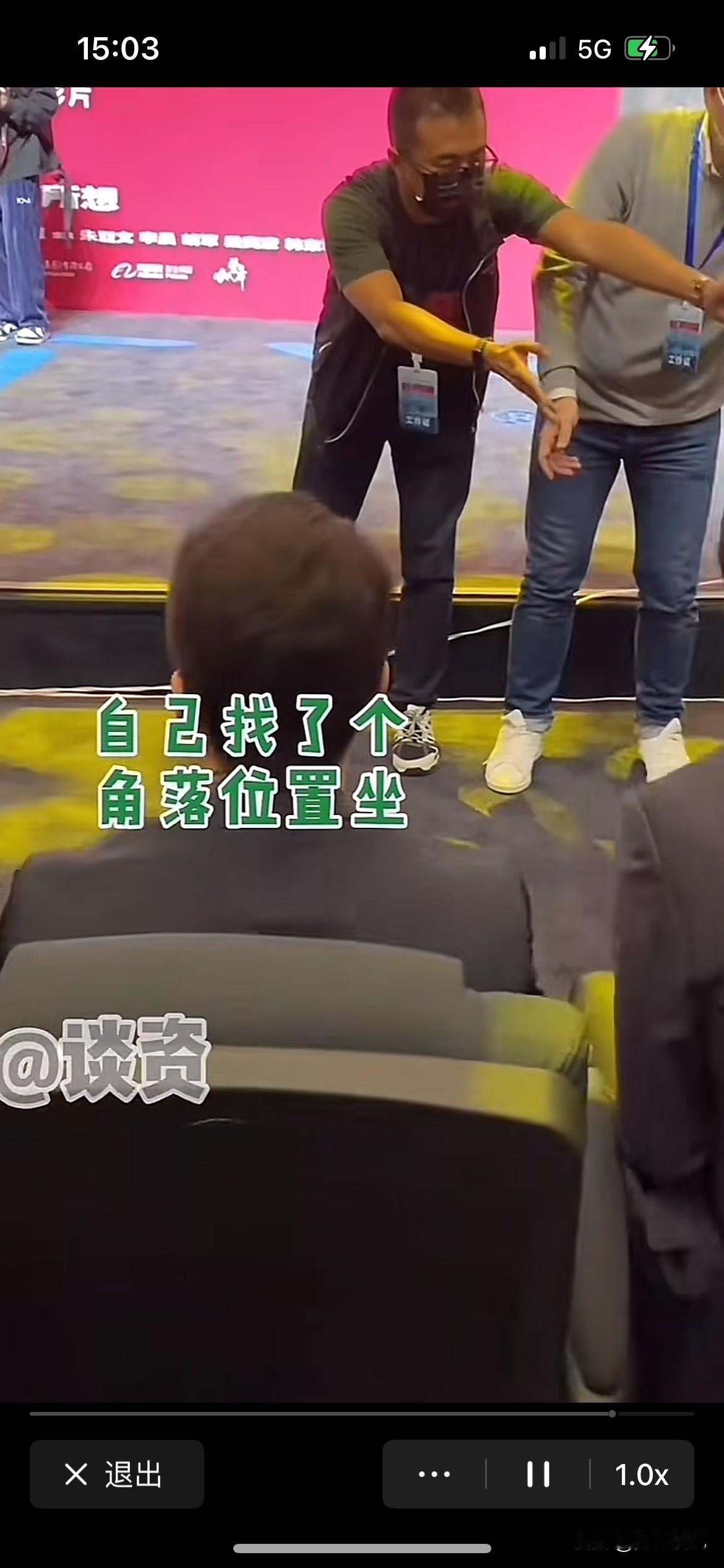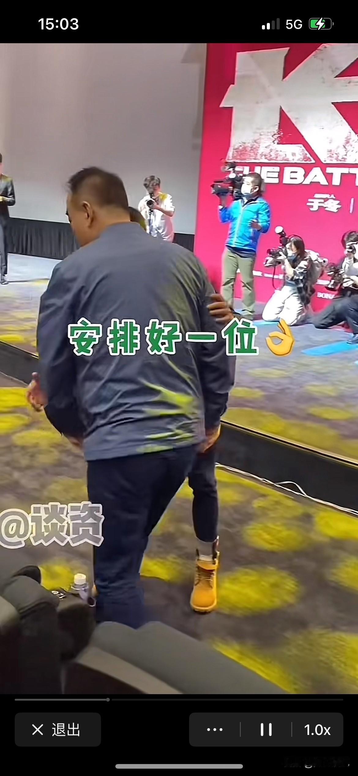 吴京老师在现场充当工作人员,操碎了心,真的很想骂一下举办方,难道节目组不知道这些是大牌明星,怎么回事的,就没有工作人员了吗?让吴京这种顶级演员忙前忙后的安排,真的不应该。 好像是抢了工作人员的工作,装了跟工作人员似的自己坐到角落,其实他干的这些活就是无用功。