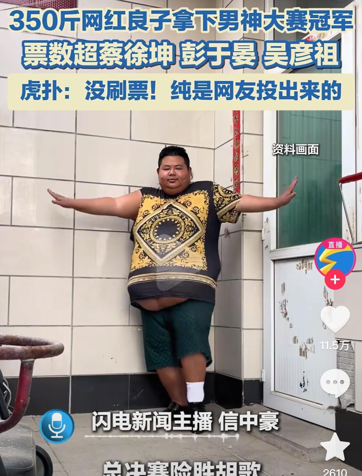 良子赢了,不是靠脸,是靠命。 350斤的胖子,直播打赏318万,一分没留,全捐了。 回执编号都贴出来了,官网能查。 没人逼他,他自己选的。 虎扑封了4万多个刷票号,可92%的票还是真人投的。 不是粉丝疯了,是大家想看个乐子,顺便把“帅哥标准”撕了扔地上踩两脚。 胡歌不生气,还约他演电影。 胖版男主,春节档上。 这哪是输赢? 这是娱乐圈终于学会了低头。 东北雨姐、芙宁娜杀进女神大赛半决赛? 真假不管,评论区已经炸了。 年轻人不追神,他们追“人”——会笑、会穷、会捐钱、不怕丑的人。 虎扑明年要分通道,严肃的归严肃,乐子的归乐子。 可谁不知道? 乐子才是流量的真祖宗。 良子没逆袭,他是替所有人喊了句:别装了,咱就爱这口。