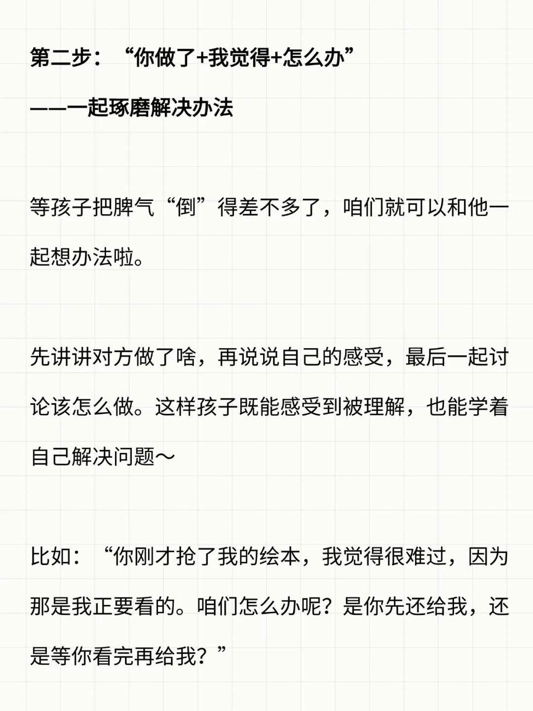 等孩子把脾气“倒”得差不多了,咱们就可以和他一起想办法啦。先讲讲对方做了啥,再说说自己的感受,最后一起讨论该怎么做。这样孩子既能感受到被理解,也能学着自己解决问题~