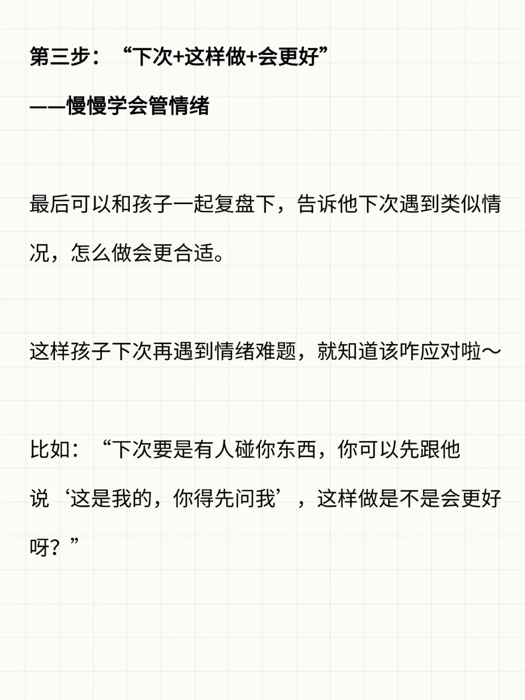 最后可以和孩子一起复盘下,告诉他下次遇到类似情况,怎么做会更合适。这样孩子下次再遇到情绪难题,就知道该咋应对啦~