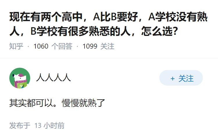 现在有两个高中,A比B要好,A学校没有熟人,B学校有很多熟悉的人,怎么选?