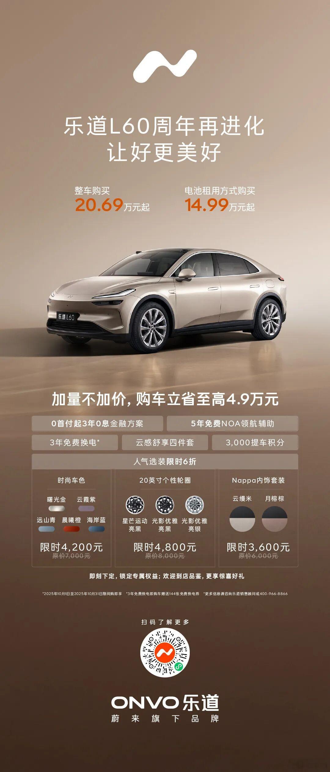 而且乐道L60也已经再进化,升级后产品体验好上加好,加量不加价,更享个性选装限时6折。电池租用方案14.99万元起,是13-20万五座SUV高质价比的全能产品。