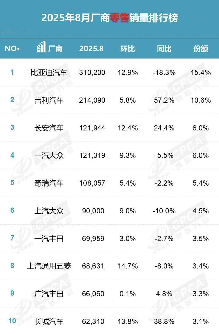 零跑汽车能挤进汽车厂商销量排行榜? 6.7万辆,真的是节节攀升,如果按照2025年8月销量,肯定是进前10了,能排到第9名,可以排在长城前面。 当然九月份算是一个销量“大月”,2024年9月第10名是7.1万辆,还是有点差距的。 所以2025年9月份,估计是挤不进前10了,但是今年四季度能行吗?【来自懂车帝车友圈】
