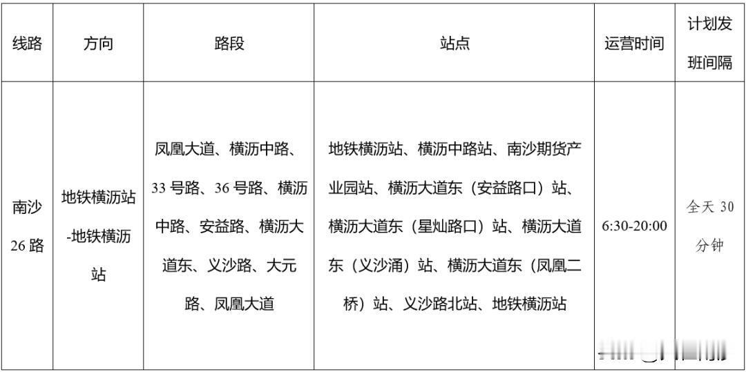 【南沙横沥岛尖环岛公交线路开通】横沥岛环岛公交来了!为进一步方便广大市民公交出行,定于2025年10月9日起正式开通运营南沙26路(地铁横沥站-地铁横沥站),新增横沥中路站、南沙期货产业园站、横沥大道东(安益路口)站、横沥大道东(星灿路口)站、横沥大道东(义沙涌)站、横沥大道东(凤凰二桥)站、义沙路北站。 考虑到目前横沥岛的人口,这条公交上座率应该值得期待哦!
