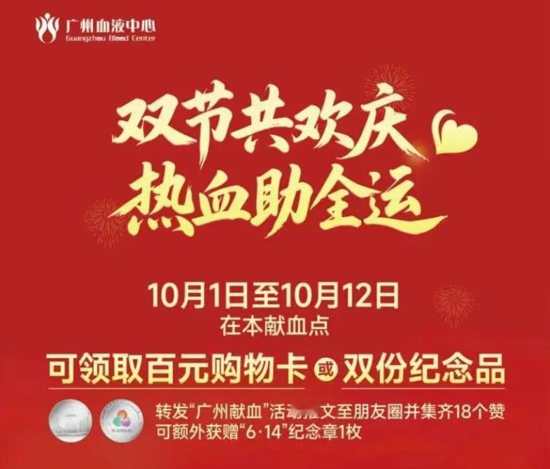 【来南沙献血有专属纪念章拿】南沙献血屋目前已经在南沙万达广场开始运营了一段时间,为了感谢献血者们的无私奉献,南沙献血屋推出南沙献血屋专属纪念章。为南沙量身打造的限量精美纪念章,限量500枚!先到先得! 10月1日至12日成功献血,还可额外获得百元购物卡或双倍纪念品(二选一)。 献血屋在国庆中秋假期时间依旧服务: 10月1日—5日,7日—8日:13:30—20:30 10月6日(中秋节):11:00—18:00 日常开放:每周六至周日13:30—20:30