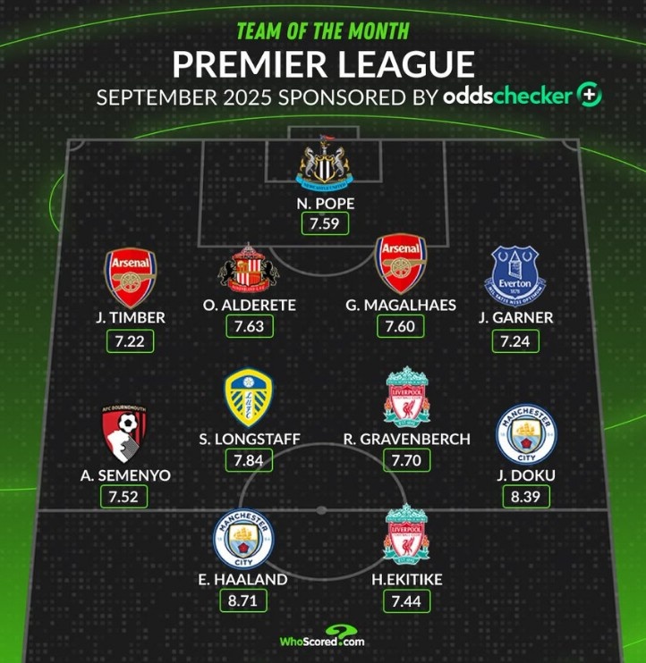 直播吧10月1日讯数据网站Whoscored盘点了英超9月场均评分最高阵容,具体如下: