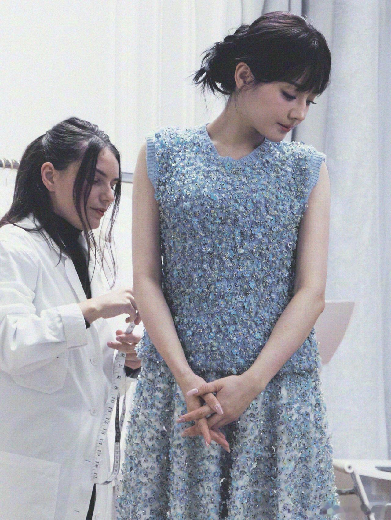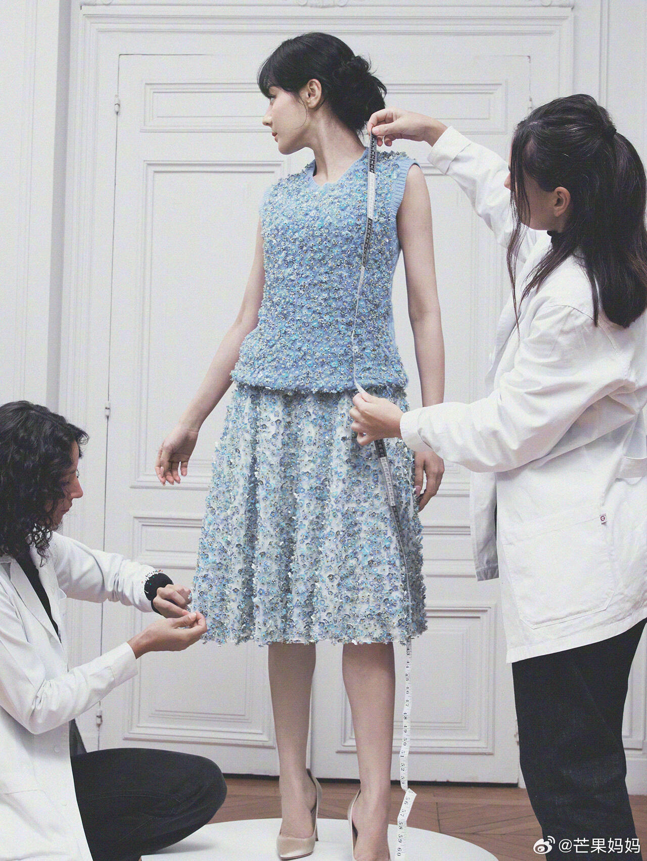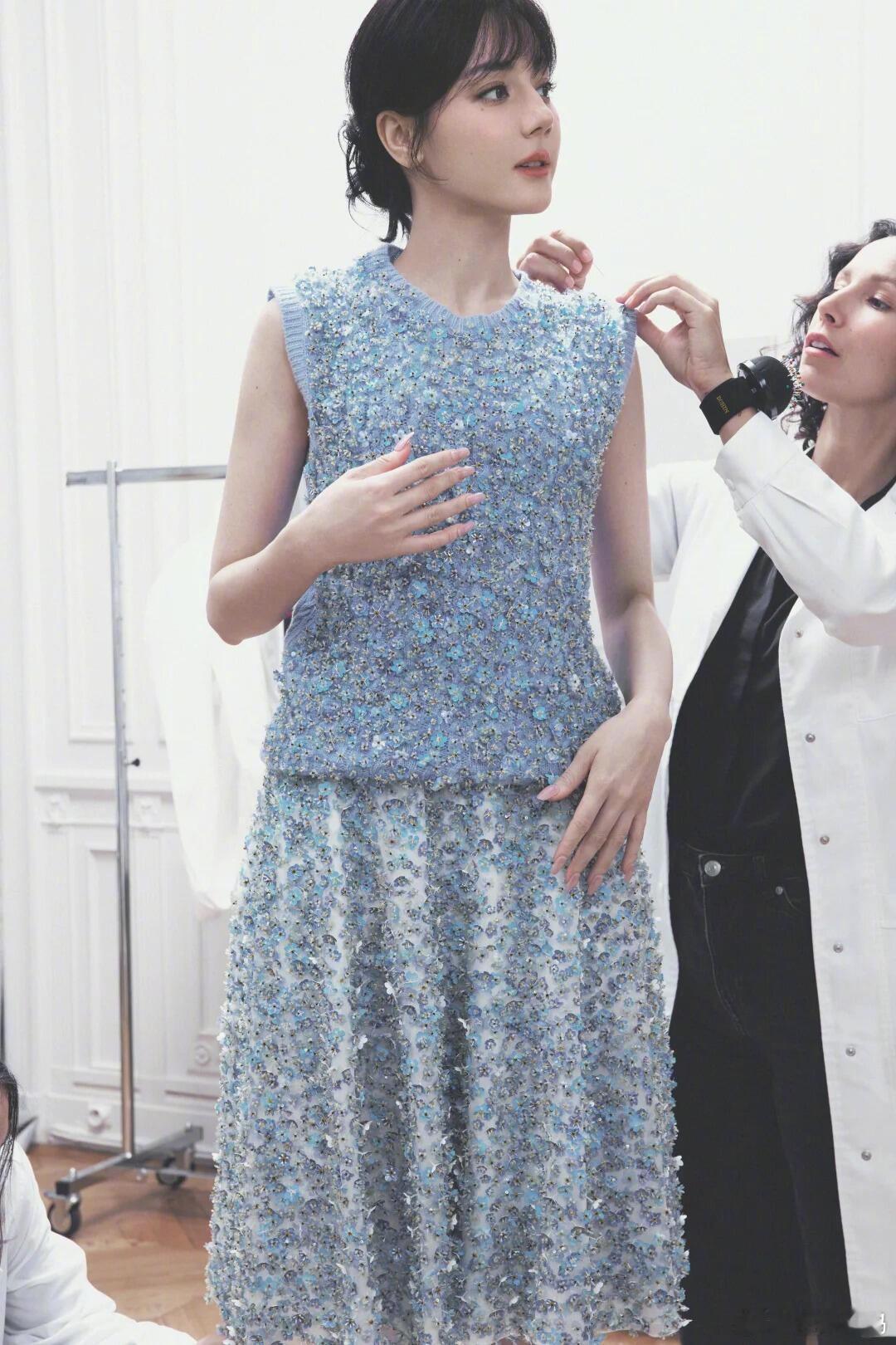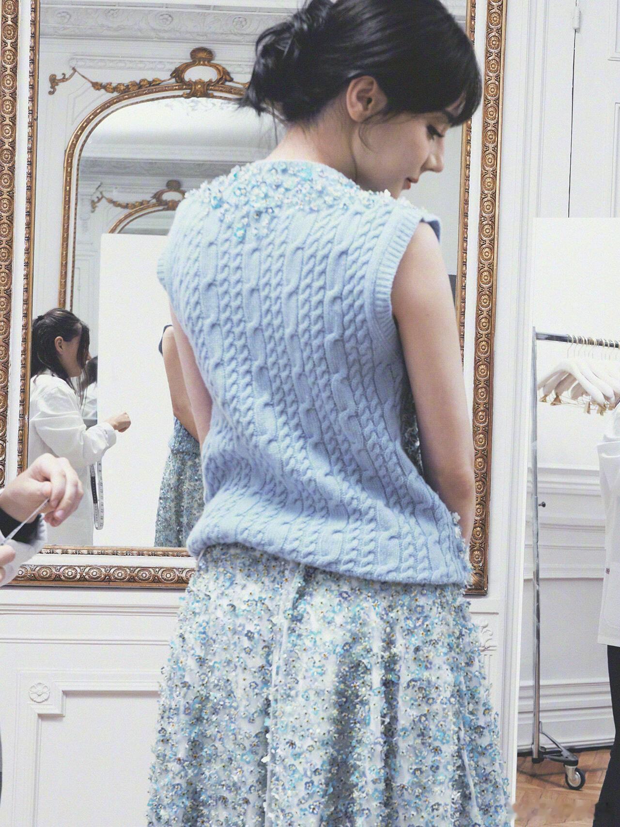 迪奥迪丽热巴又是不同的风格,迪丽热巴站在那儿,真的好像八音盒上的洋娃娃,特别优