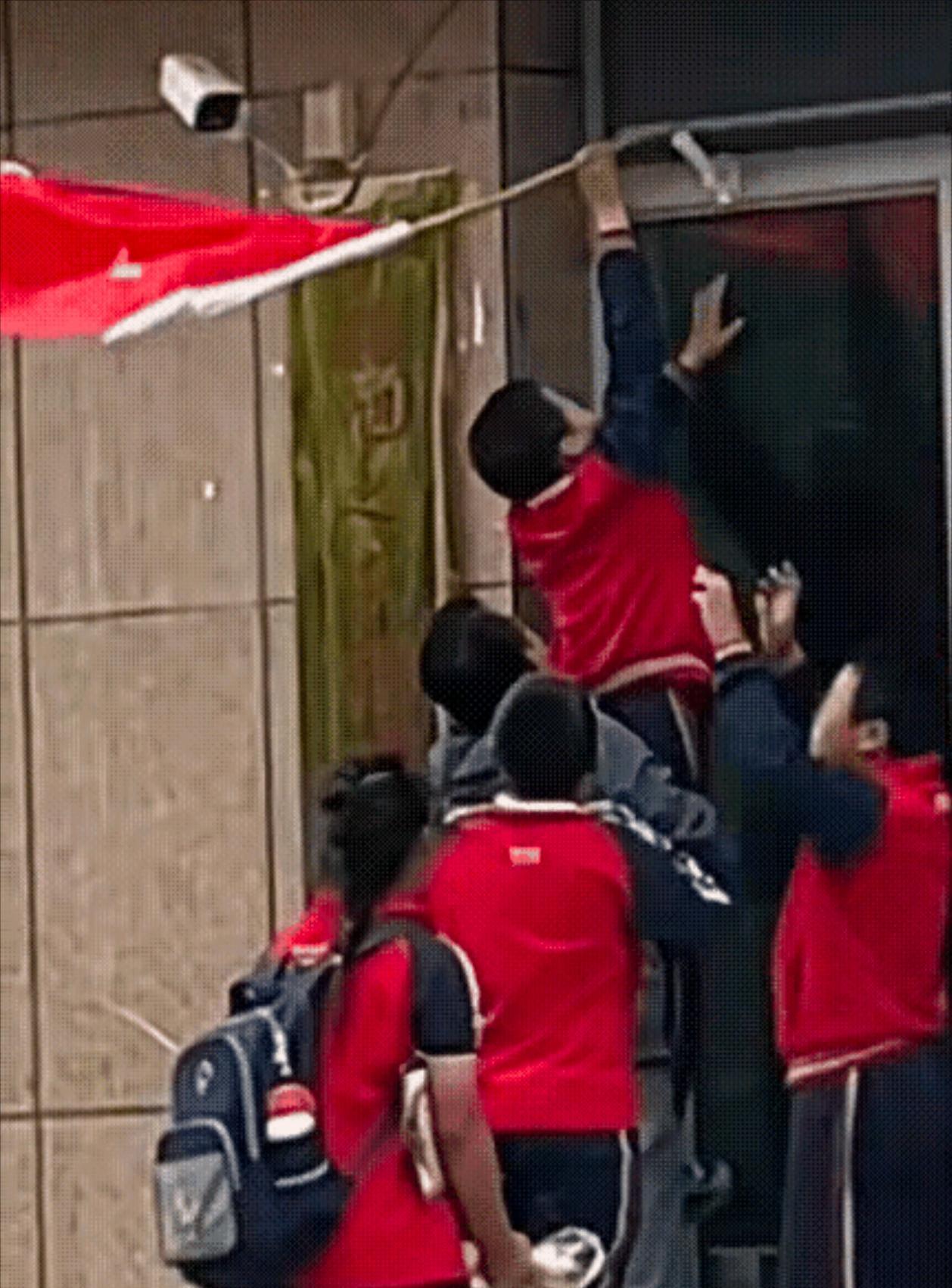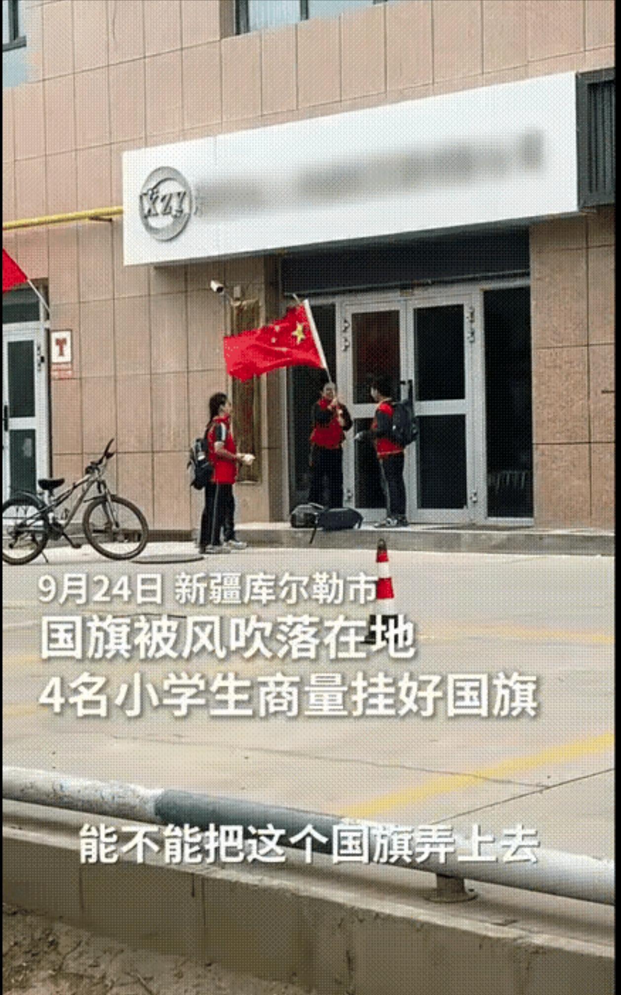 [太阳]9月24日,新疆库尔勒,一店铺门外悬挂的国旗掉在了地上,四名放学正好路过的小学生竟然直接上前先是捡起国旗,然后商量怎么挂上去。 (信息来源:新华社——街头暖心一幕!国旗被大风吹落,几名小学生商量如何挂回原位......) 库尔勒路边商铺,那面五星红旗红得鲜亮。 它本是当地街头最寻常的风景,却在一阵急风掠过的瞬间,突然变了模样。 风势比较猛,国旗的边角被扯得翻卷起来,落在离地面一米多高的基座旁。 这一幕没逃过四个孩子的眼睛。他们穿着校服,书包带子斜挎在肩上。 看到国旗落地,四个小小的身影几乎同时停住。 走在最前面的男孩先动了,他快步上前,拾起国旗。 拾起来的时候,他还抬手拂了拂旗面上的褶皱。 男孩抬头望向店铺外面的挂钩,踮起的脚尖,把国旗举过头顶,想把它重新挂上去。 他手臂绷得笔直,可指尖离挂钩还有一大段距离。 站在旁边的两个女孩看在眼里,悄悄凑到一起。 她们对视一眼,不用说话就有了默契,双双走到男孩身后,双脚分开站成小马步,手腕交叉叠在一起,搭出一个小小的 “人梯”。 男孩回头看了看,眼神里带着犹豫,怕自己踩上去会让伙伴们受累。 可目光落回手中的国旗上,他还是轻轻抬起脚,小心翼翼地踩在了女孩们的手腕上。 即便这样,国旗依旧够不到挂钩,男孩的眉头轻轻皱了起来,却没把脚挪开。 就在这时,马路对面走来一个穿深色外套的男人。 他脚步匆匆,像是要赶去上班。 可路过店铺的时候,他的目光扫到了孩子们,扫到了男孩手里的国旗,脚步猛地停住。 没有丝毫迟疑,他快步穿过马路,走到孩子们身边。 男人没有打断他们,只是慢慢蹲下身子,双手稳稳托住男孩的腰,把他往上托。 男孩感觉到身后的力量,重新挺直了后背,把过国旗平整地挂在灯杆上。 旁边的两个女孩松开手腕,仰着头盯着国旗,小脸上满是期待。 “咔嗒” 一声轻响,卡扣重新扣住挂钩,国旗顺着风展开,鲜红的旗面在晨光里舒展开来。 男人慢慢把男孩放下来,看着飘扬的国旗,嘴角轻轻扬了扬。 他抬手摸了摸几个孩子的头,之后便转身离开。 这一幕,被记者拍了下来,回忆起这事,他还带着感动。 视频传到网上后,有人说,孩子们可能还说不出 “爱国” 到底是什么,可捡国旗、挂国旗的样子,就是最真诚的热爱。 也有人说,那个男人的默默帮忙,让这份热爱更暖了 —— 原来家国情怀不只是轰轰烈烈的,它也可以是普通人在街头随手帮的一个小忙,是孩子们小心翼翼护着的一面国旗。 四个孩子的身影、一个男人的援手,没有惊天动地的情节,却让人心里暖暖的。 这故事里藏着的,是最朴素的赤诚,是刻在中国人骨子里的热爱。