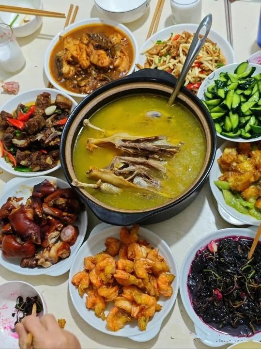 昨日家人小聚,摆了满满一桌子菜。我最钟情中间那道“老鸭汤”,既滋补又可口。友友们,你们能认出其他的菜吗?