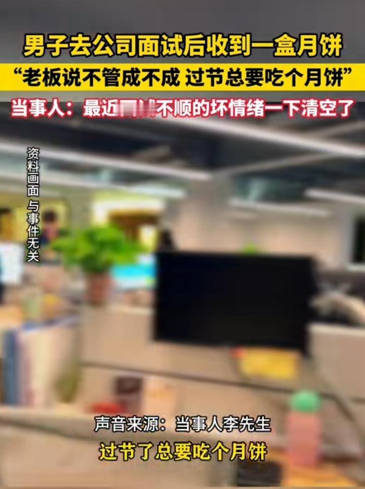 当事人李先生最近面试了多家企业一直没有找到合适的,情绪非常低落,简直可以用郁闷来形容自己的遭遇,昨天去一家公司面试,过程挺顺利的不过要等公司通知,就在他离开之际老板说:拿份月饼走吧,李先生推脱我都没有给公司提供任何服务怎么好意思呢!老板表示:无论结果怎样过节总是要吃月饼的,李先生也不好推脱,于是接住了工作人员发给的月饼。 那一刻他是含着眼泪走出了公司,抬头看向天空是那么的蓝,心里多日积攒的失落瞬间全无,生活就是这样无论经历多少困难,总会在不经意间一点小小的举动就让人信心百倍。 记得以前我去一家公司上班,一名主管结婚,由于我的位置比较靠里他把很多糖果发给离我不远的一名女员工,基本就是两个人的量,那名女员工以为都是给她的,于是把所有糖果都装进了自己的包里,厂里所有人都在吃糖果只有我没有,那一刻感觉好尴尬啊! 这时候被一名同事看到了,他从自己的糖果里拿出一半给到我手上说,对我说吃糖,我当时心里挺感激的,过了十多分钟那名女生从包里拿出一个糖果给我,说我也给你一颗,我说我有龋齿不能多吃还是你多吃点,她没好气的说其实这一颗我都不大舍得给你,留给我家孩子吃才是我心里所想的。 你说她小气吧可她也是一个有母爱的人,只能说别人不坏只是对你没有情分。 出门在外一点善意可能就是别人漂浮于海面的浆板,行走于暗夜的明灯,所谓星星之火可以燎原,俗话不以善小而不为,在别人有难处的时候拉一把,或许他的世界能有不一样的精彩,感谢心中有爱大义凛然的热心人士。