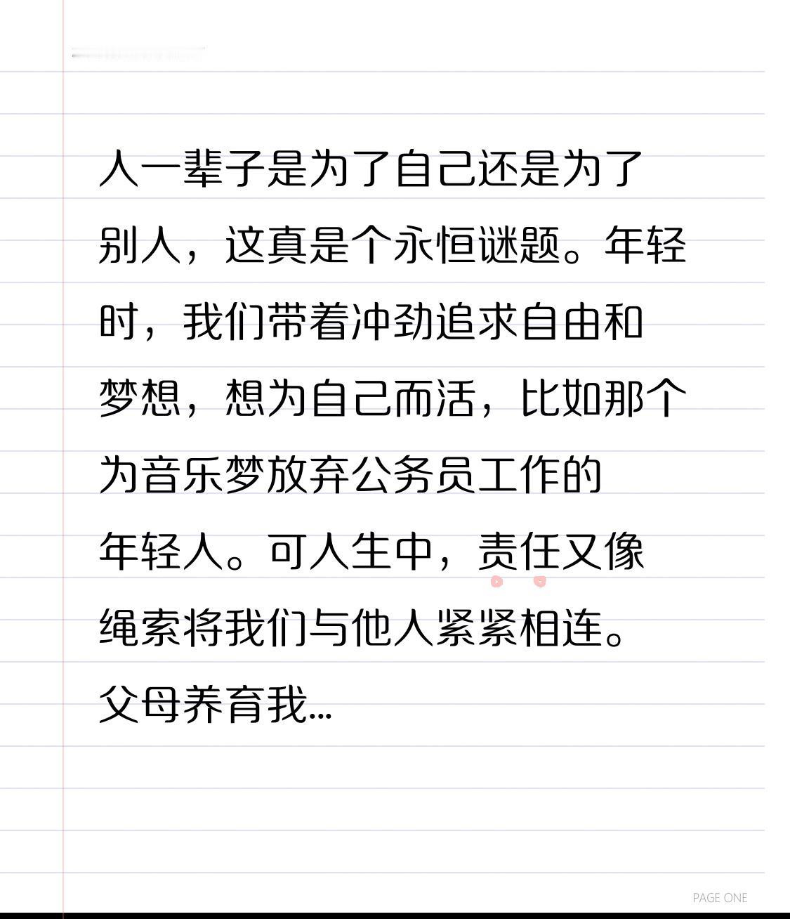 人一辈子是为了自己还是为了别人,这真是个永恒谜题。年轻时,我们带着冲劲追求自由和梦想,想为自己而活,比如那个为音乐梦放弃公务员工作的年轻人。可人生中,责任又像绳索将我们与他人紧紧相连。 父母养育我们,我们要尽孝;有了孩子,要抚养他们长大。就像一位父亲不舍得吃一碗面,却给孩子买最好的水果。其实这两者并不矛盾,为自己活能让内心充实,为别人付出能让人生有更深层次的意义。我们应在两者间找到平衡,既倾听内心声音,也不逃避肩上的责任。