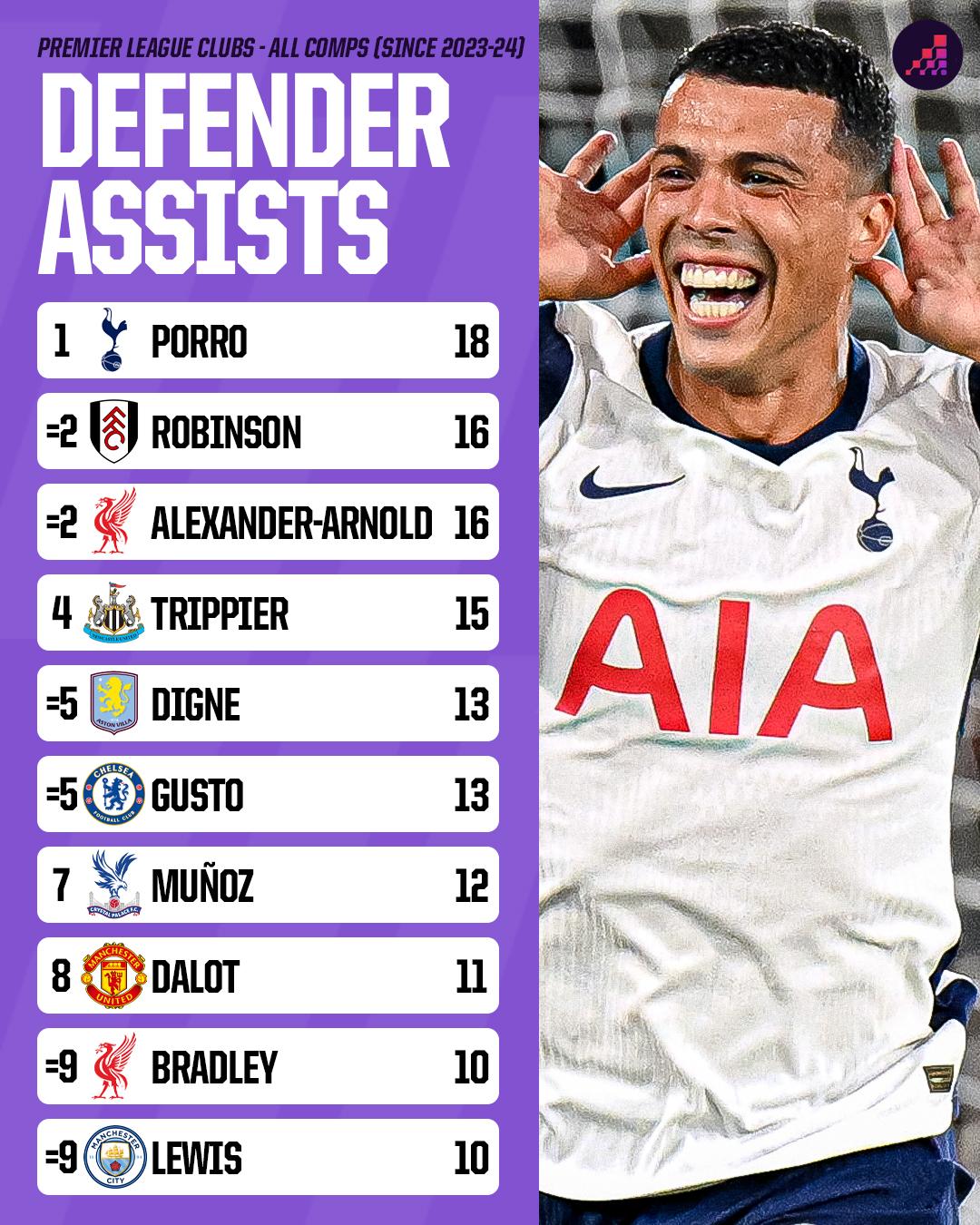 虎扑10月01日讯Opta数据统计自23/24赛季各项赛事中助攻次数最多的英超后卫,波罗18次居首。