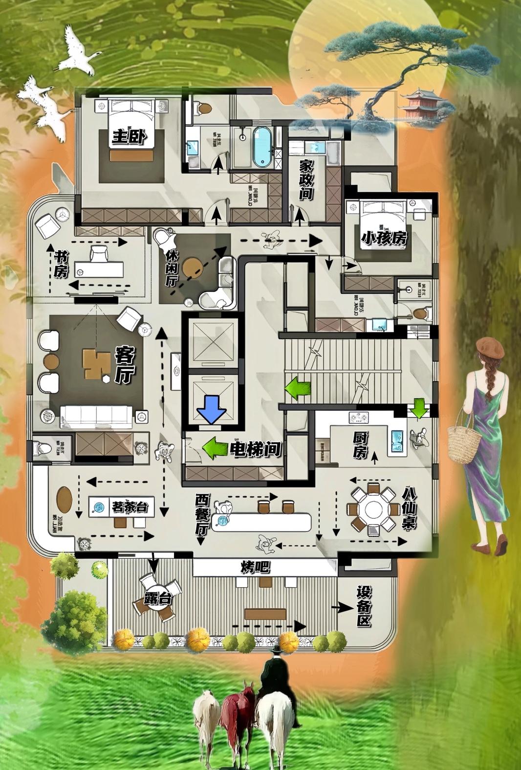 开窍了,幸运的双拼,开窃了,凭着几张桌子,336㎡出尽了风头。没有各种瞎折腾的东西,东一棒槌西一榔头,整布局! 最狠的二分法,打造出最硬的两居室! 大家平布局缜密,洄游线路超群,怪不得能成为超级大平层之下第一家! 唉!主要两个卧室太低调,公区太炫耀啦! 卧室虽是一个三件套,太普通,尤其是床尾做柜子,收纳对床头,只有刚需房,常见的贮物手法,还有步入式衣帽间,也是小门小户的必备神器,对三百平的房子,是不是空间太幽默,收到纳太可爱了! 这是说,卧室放弃舒适,客厅是王牌,餐厅更是王中王,尤其是吃喝玩乐的地方,算上露台,占半个房子,气场排第一! 把三联横厅的位置,留给餐厅,大概也是本宅最大的道理,自古以来,靠面积排座次! 餐厅靠着六米的烤吧,打出了气场,成为第一社交平台,与十五的花园,做最强的搭档! 空间加意境,这张牌,比任何一空间,都像是王牌! 虽然客厅与书房,也是横厅,气质差三分,高雅差四分,视野差七分!