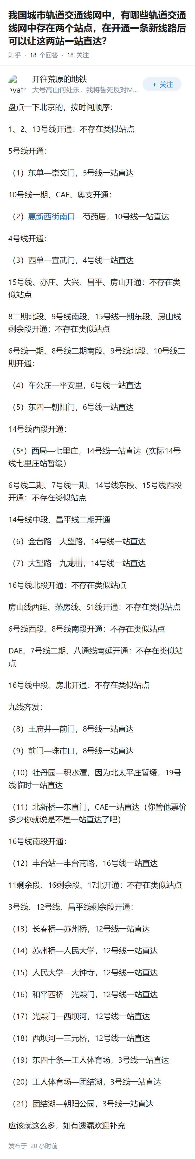 我国城市轨道交通线网中,有哪些轨道交通线网中存在两个站点,在开通一条新线路后可以让这两站一站直达?