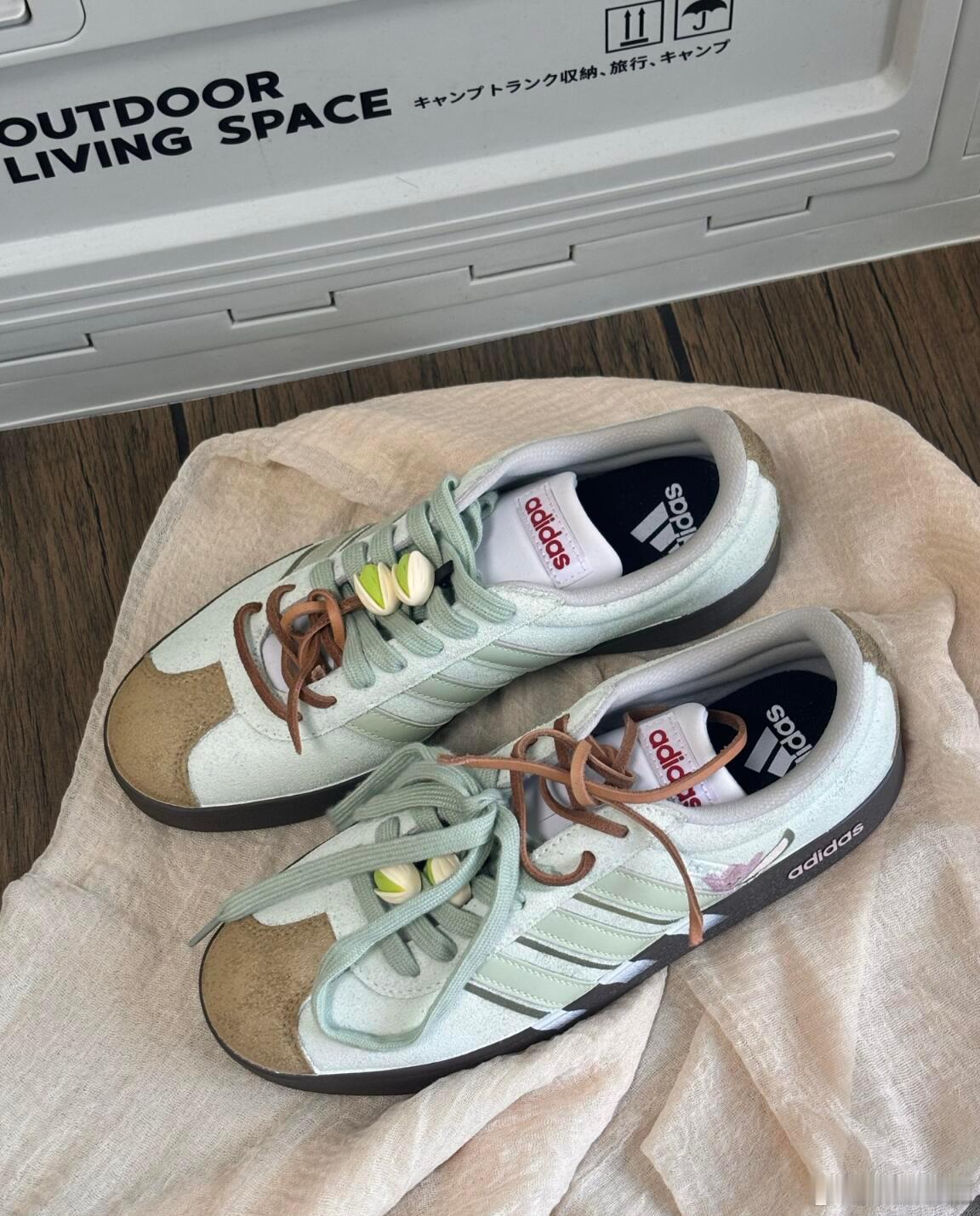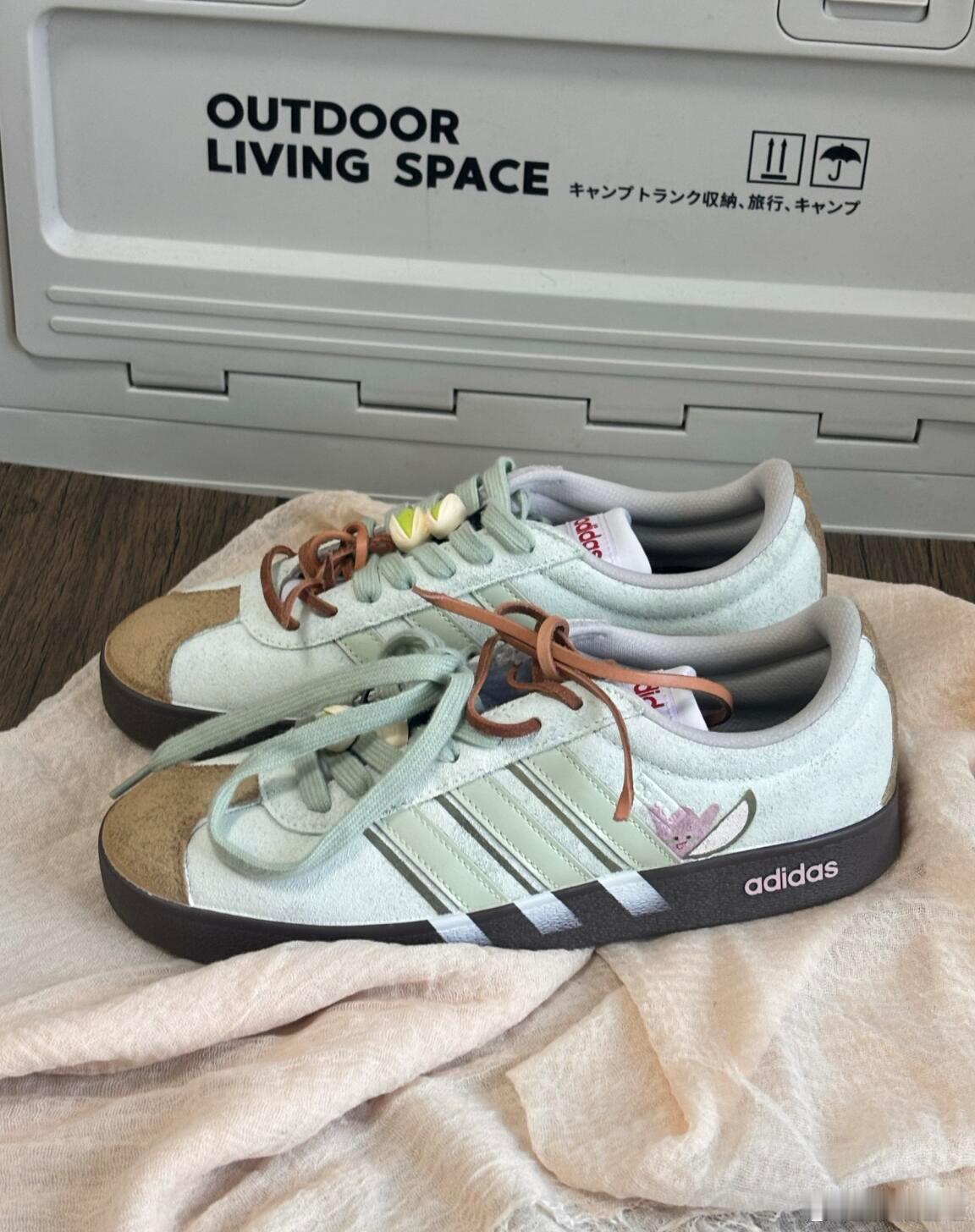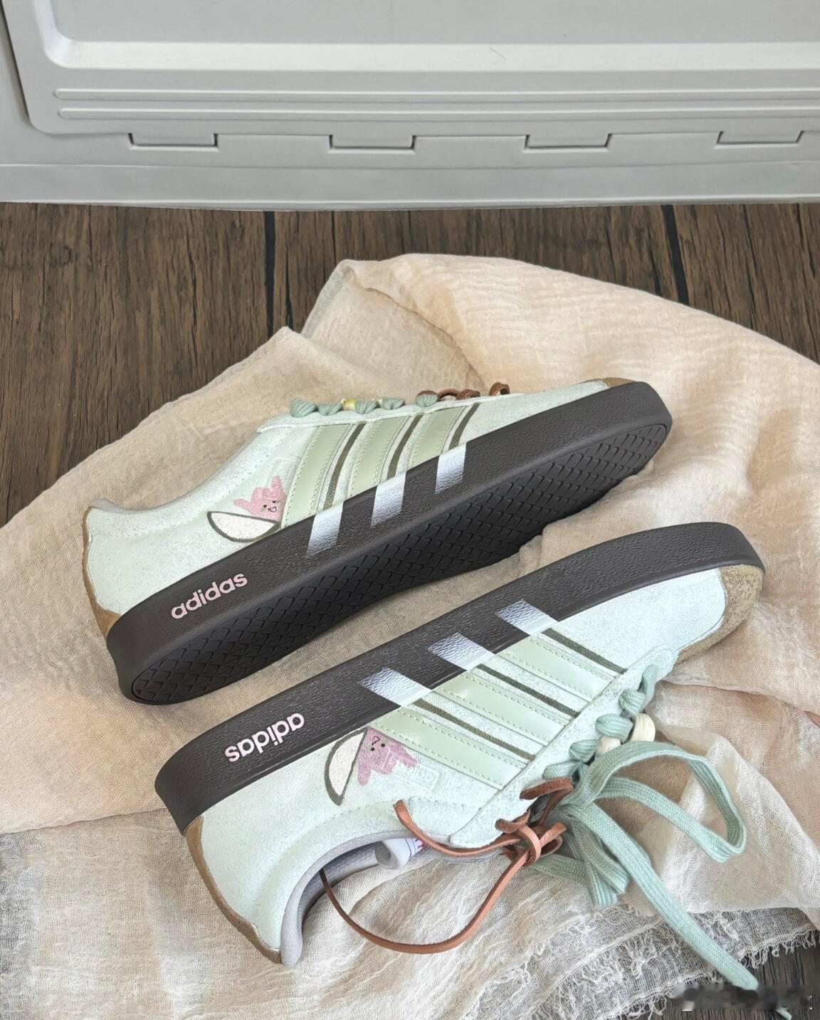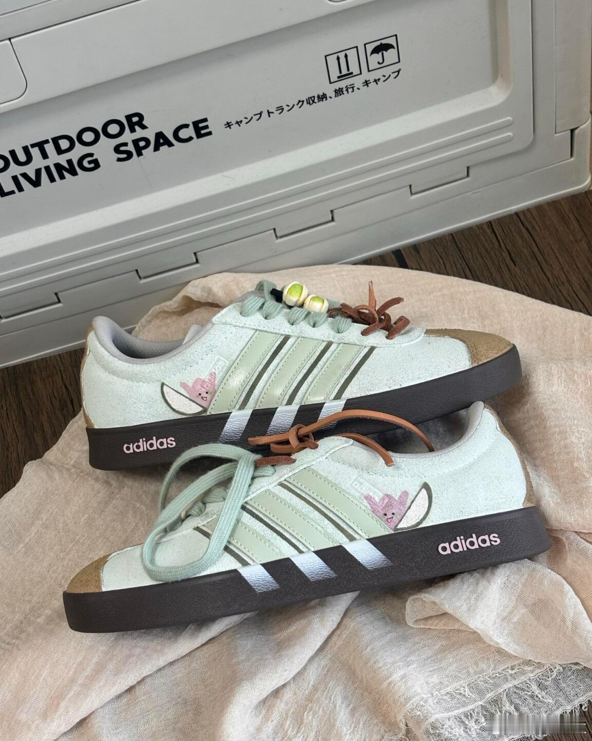 这双阿迪达斯运动鞋巧妙融合了品牌经典基因与户外休闲趣味。鞋身采用清新的浅绿色调,侧面装饰有可爱的卡通图案,为经典的三条纹标志注入了活泼灵动的气息,打破了运动鞋的传统框架。独特的双色鞋带设计——浅绿与棕色的搭配——与深棕色耐磨鞋底相呼应,共同营造出自然、和谐的户外氛围。