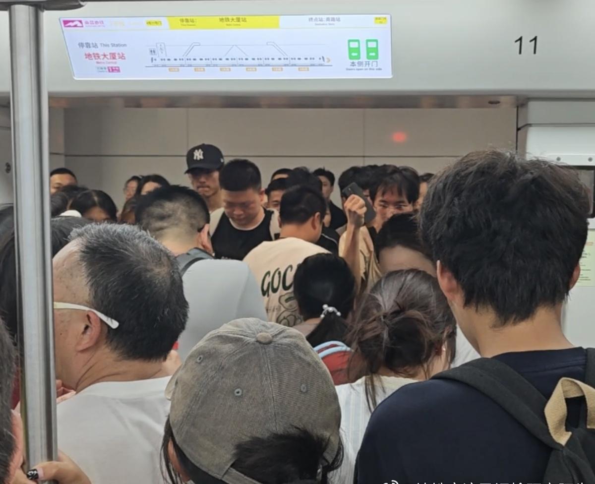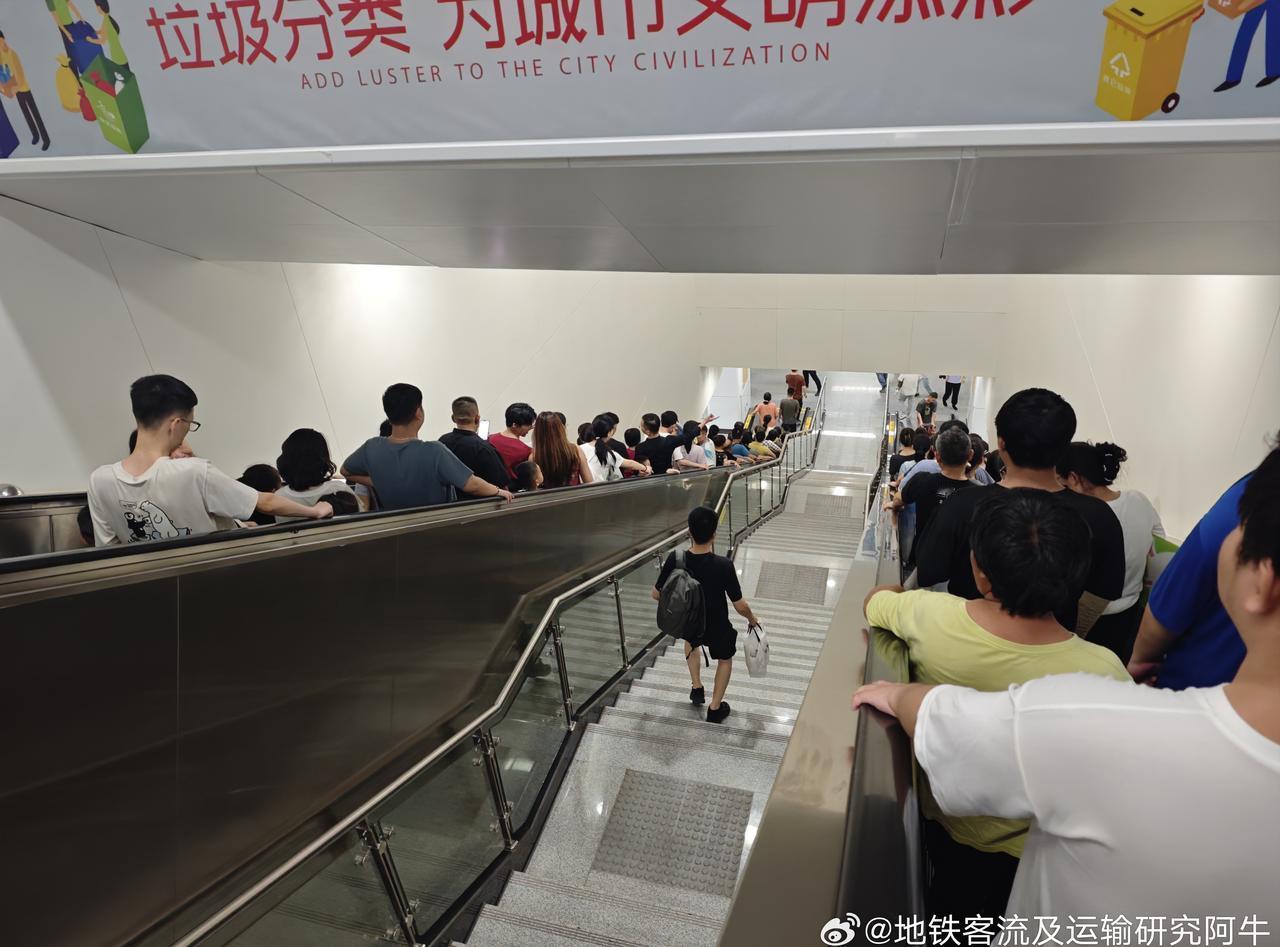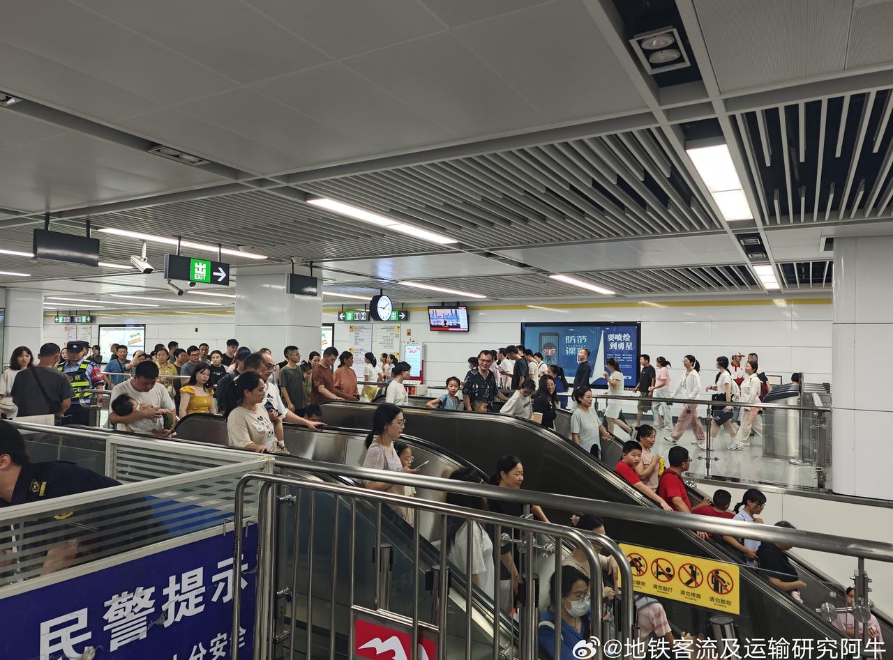 【南昌地铁2025国庆节南昌国庆烟花晚会 鏖战下半场】 网友:2025年10月1日(国庆节),南昌地铁2号线红谷中大道站(距离烟花晚会主会场1.5km), 21:05,4号口进站(图1),21:08站厅(图2、图3), 21:17地铁2号线雅苑路→地铁大厦区间(图4),21:19地铁大厦站上下客(图5)。 红谷中大道站的客流组织主要做法有: ①3、4号口只进不出,1、2号口只出不进; ②进站出站闸机均释放,其中出站闸机供无包小包乘客进站用(只用金属探测器扫),其他乘客走正常安检通道; ③站厅到站台全部扶梯改为下行。