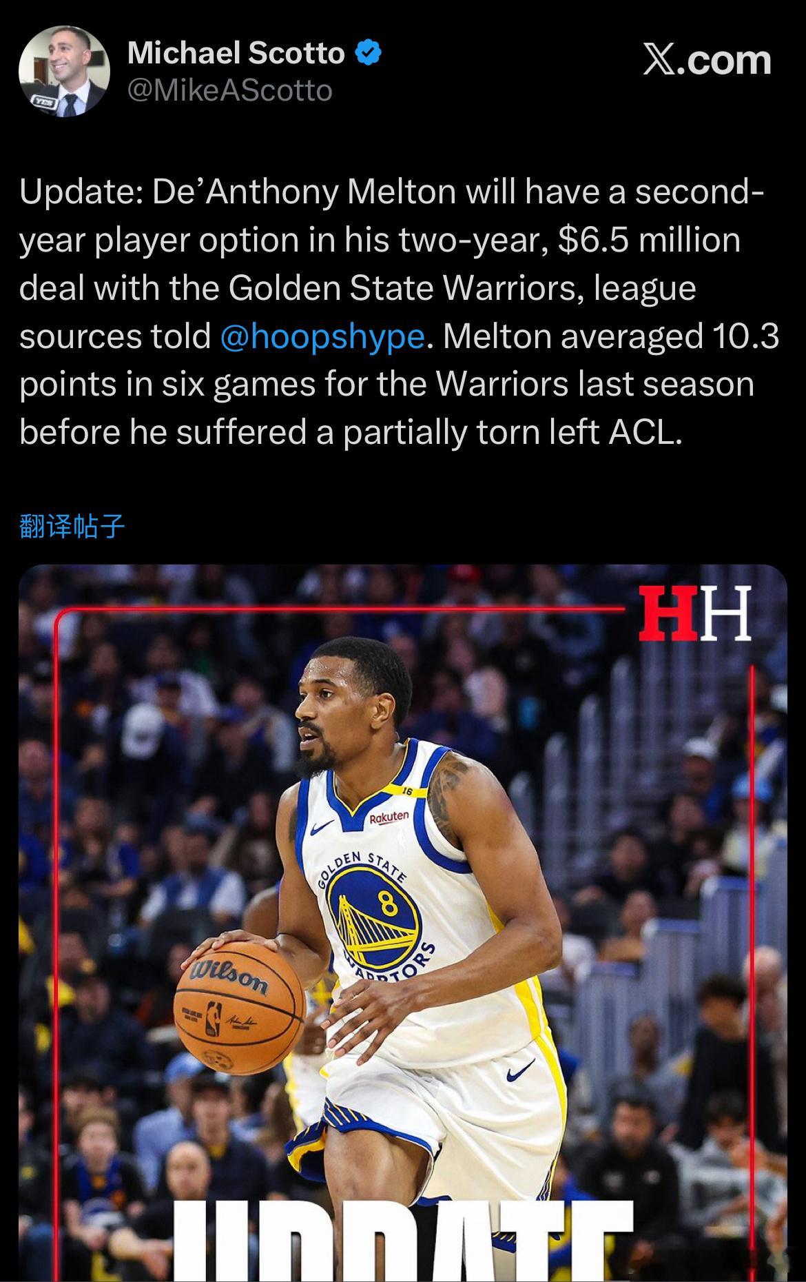 Scotto:梅尔顿与勇士签订的是一份2年650万的合同,第二年球员选项