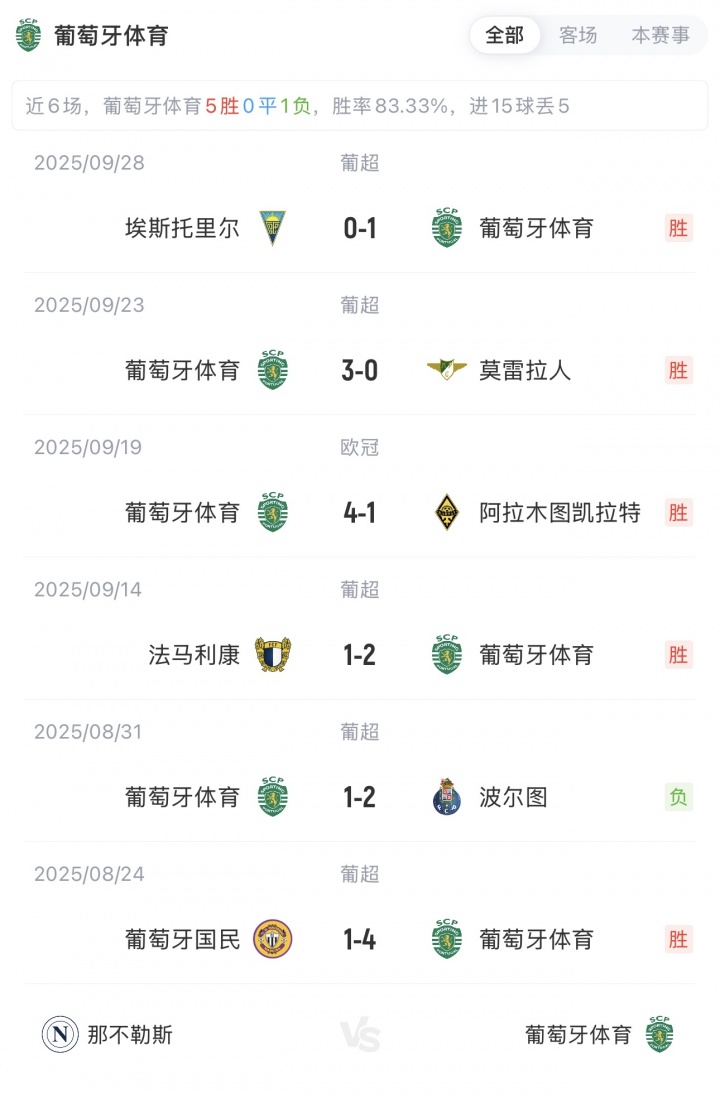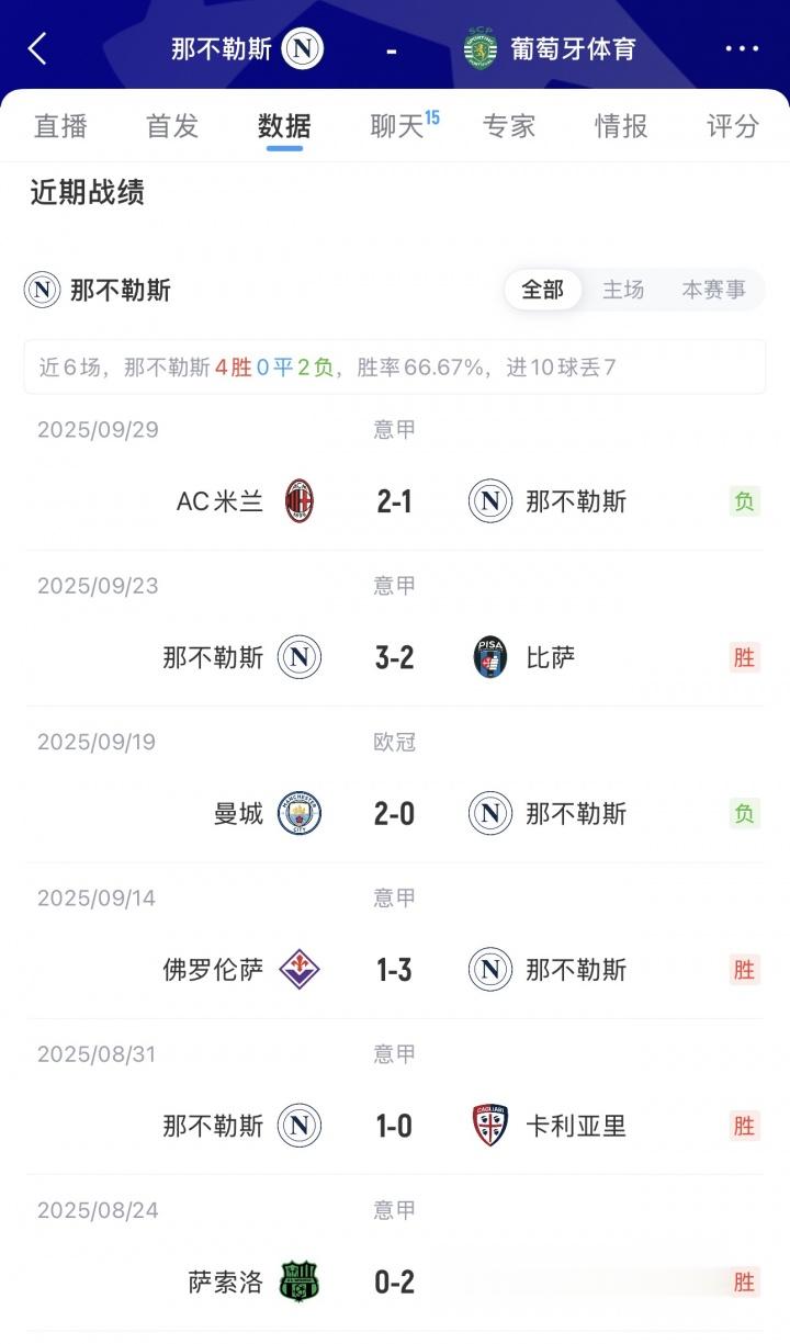那不勒斯上一轮欧冠,0-2不敌曼城;葡萄牙体育上一轮欧冠,4-1战胜阿拉木图凯拉特!