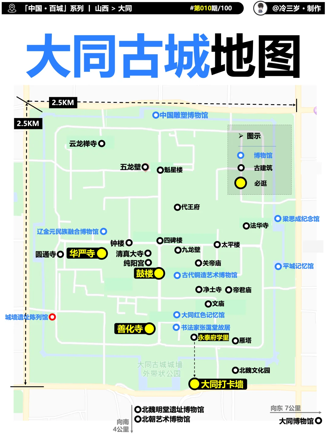2.如果时间非常宽裕,可以在大同古城里citywalk 1-2天,主要打卡景点见图2