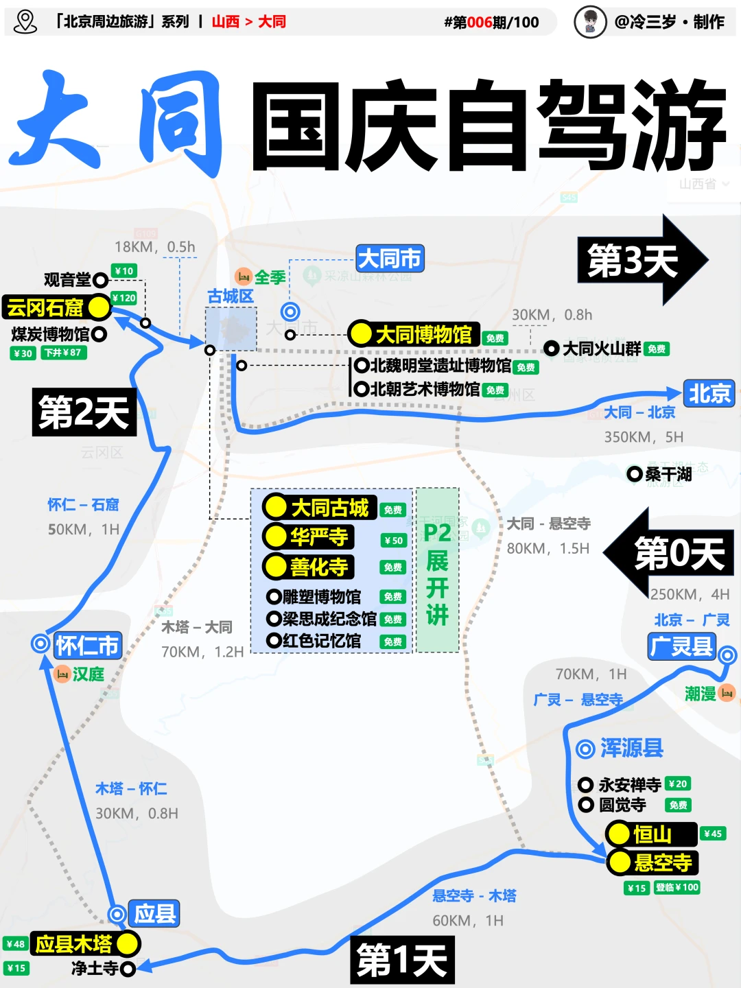 常规路线,是把大同、悬空寺、木塔当初三角形,往返北京/天津会有重复的路