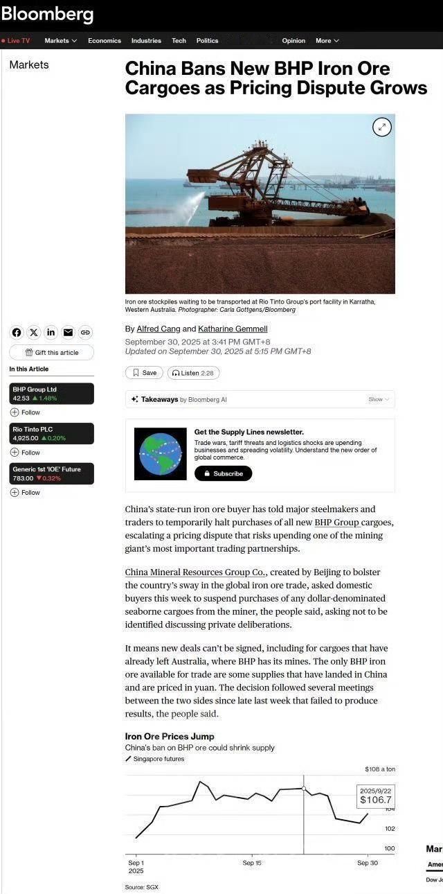 中方果断出手,澳方秒变失望! 据彭博社消息,中国矿产资源集团已要求国内买家暂停采购以美元计价的必和必拓海运铁矿石。澳大利亚总理阿尔巴尼斯表示“令人失望”,并期望问题能够尽快得到解决。 这一决定是在双方历经多轮磋商却毫无结果之后做出的。早在9月初,中方就已要求钢厂停止购买必和必拓的金布巴粉,此次禁令进一步升级,充分彰显了中方增强价格影响力的坚定决心。 中国身为全球最大的铁矿石消费国,占据全球海运铁矿石进口量的约75%,却长期没有话语权。澳大利亚长期以来在铁矿石贸易中凭借其资源优势占据主动,不断抬高价格收割利益,全然不顾中方作为最大消费国的合理诉求。此次中方果断出手,也是对澳方此前种种不合理行为的有力回击。 相信此举必将对澳大利亚经济有着重大影响。