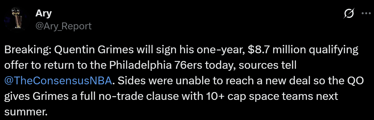 其具体报道如下:消息人士透露,昆廷-格兰姆斯将于今日签下一份为期一年、价值870万美元的资质报价合同,回归76人。双方未能达成一份新的合同,因此这份资质报价将赋予格兰姆斯完整的交易否决权,而明年夏天有超过10支球队将拥有薪资空间。