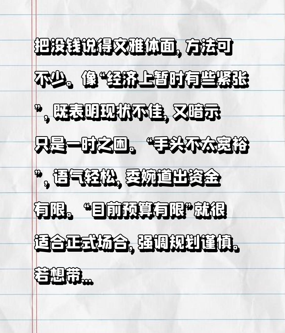 把没钱说得文雅体面,方法可不少。像“经济上暂时有些紧张”,既表明现状不佳,又暗示只是一时之困。“手头不太宽裕”,语气轻松,委婉道出资金有限。“目前预算有限”就很适合正式场合,强调规划谨慎。 若想带点古典幽默,“囊中羞涩”就不错。也可以文艺些,“唯有清风知我意,化名西北入我喉”。调侃点说“银行在我这存了10万”,别人一听还以为你很富有,实则反向表达没钱。这些说法既能传达情况,又不失体面。