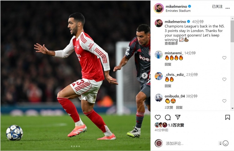 阿森纳中场梅里诺社媒晒出比赛照片,并写道:“欧冠重回北五区,将3分留在伦敦。”