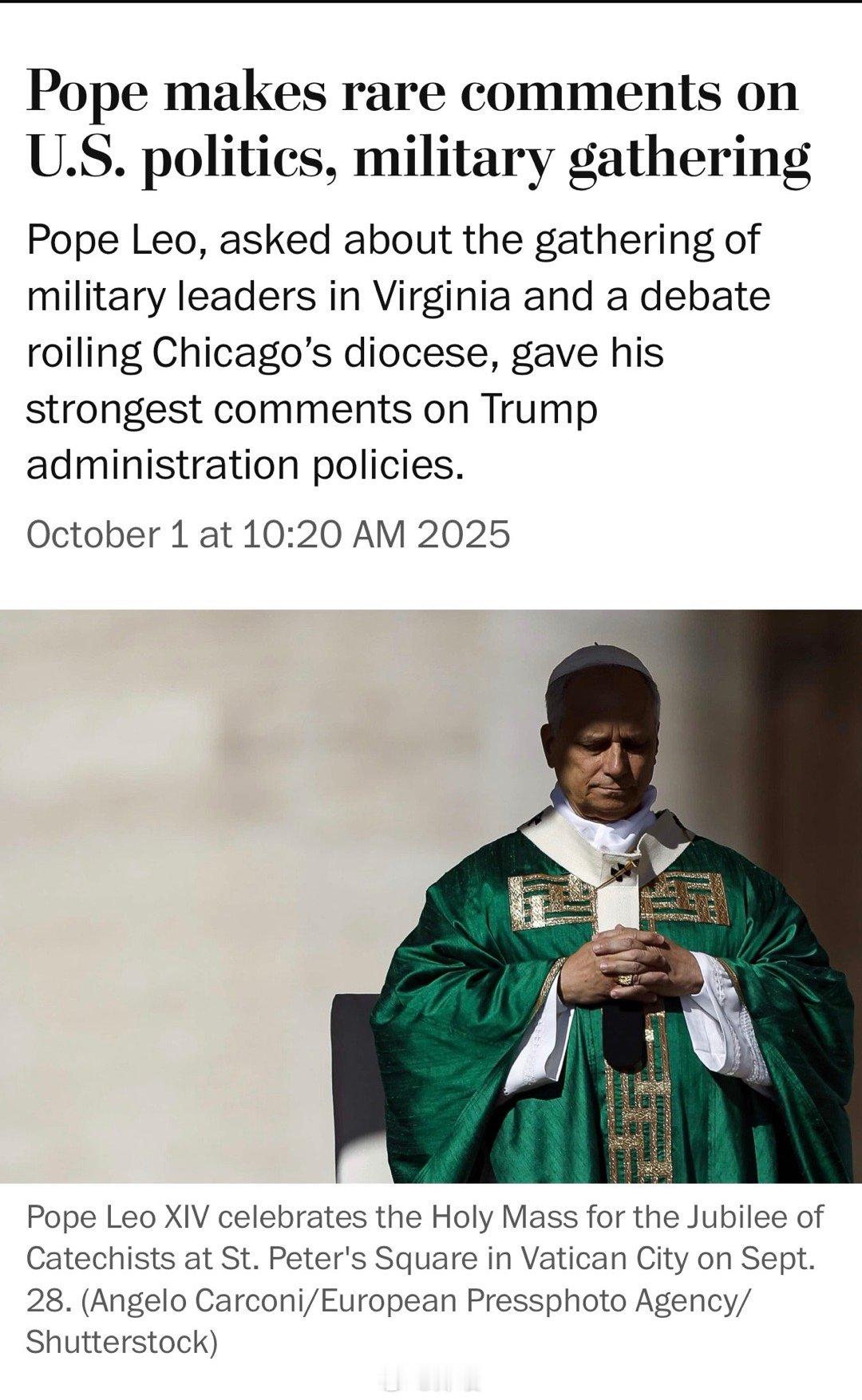 教宗利奥十四世罕见地涉足美国政治,他将特朗普总统和国防部长赫格塞思周二在军事指挥官会议上的强硬言论描述为”令人担忧”,并批评那些自称”支持生命”的人反对堕胎,却不反对对移民的”非人道待遇”和死刑。