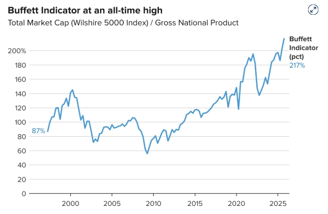 数据显示,标普500自4月低点以来已反弹近40%,由大型科技公司主导。与此同时,“巴菲特指标”(总市值与GDP之比)已飙升至217%,远高于互联网泡沫与2021年新冠疫情期间的高点。巴菲特曾称该水平是“玩火”。