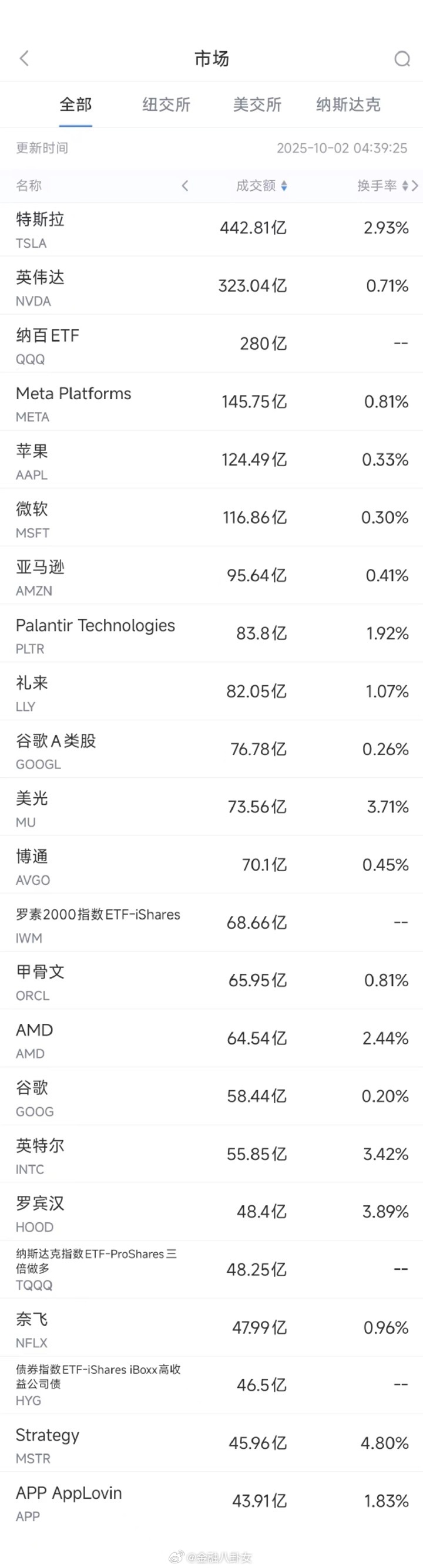 10月2日美股成交额前20:马斯克成为史上首位财富达5000亿美元的人[并不简单]