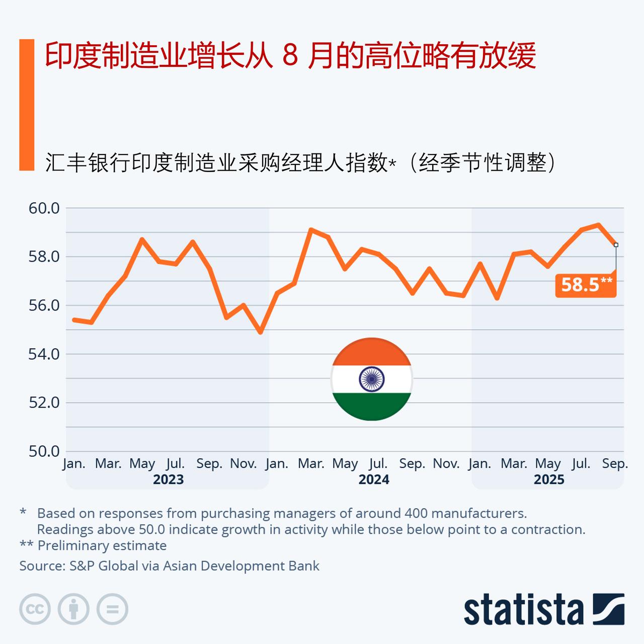 汇丰银行采购经理人指数显示,印度制造业增长从 8 月的高位略有放缓 根据初步的快速数据统计,汇丰银行印度制造业采购经理人指数(PMI)在 9 月份降至 58.5,低于 8 月份创下的 17 年来的新高 59.3。尽管略有放缓,但该指数仍稳稳处于增长区间,每高于 50.0 的读数都表明制造业活动在增长。 汇丰银行首席印度经济学家普兰吉尔·班达里表示:“美国对印度征收 50%的关税,很可能导致 8 月至 9 月期间新出口订单的增长速度放缓。”他还指出,由于商品和服务税税率降低,国内需求的增长部分抵消了关税提高带来的影响。 从中期趋势来看,印度的制造业似乎有望实现持续增长。在过去两年半的时间里,制造业采购经理人指数(PMI)仅有一次低于 55(即在 2023 年 12 月)。