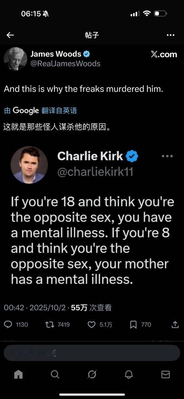 如果你18岁,你认为自己是异性,你有精神疾病,如果你8岁,认为自己是异性,你的母亲有精神疾病——查理·柯克 ​​​