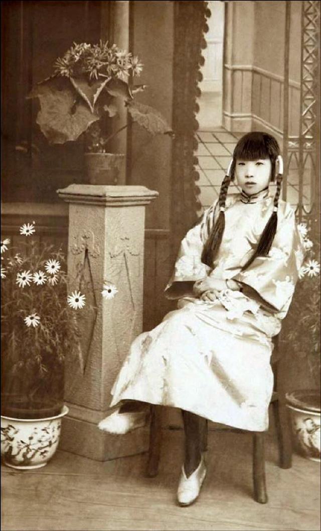 这张摄于1920年代的照片里,少女身着带有素雅花纹的浅色长衫,两条乌黑油亮的长马