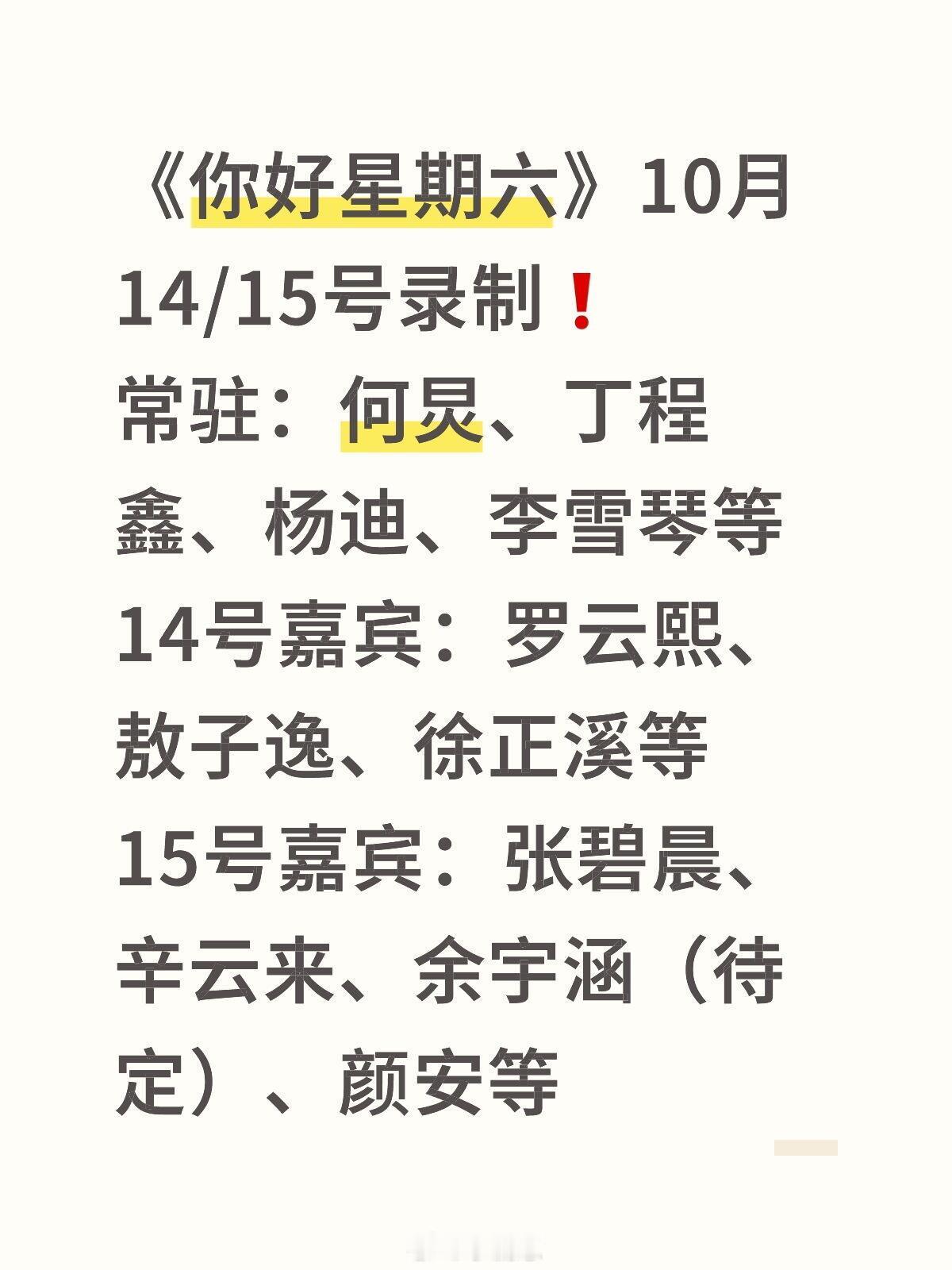 15号嘉宾:张碧晨、辛云来、余宇涵(待定)、颜安等