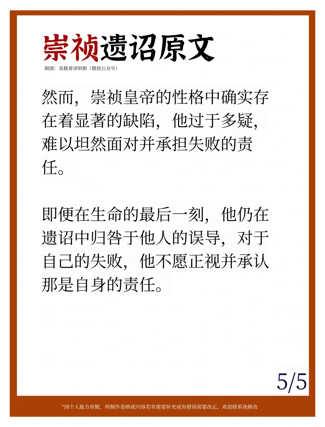 然而,崇祯皇帝的性格中确实存在着显著的缺陷,他过于多疑,难以坦然面对并承担失败的责任。即便在生命的最后一刻,他仍在遗诏中归咎于他人的误导,对于自己的失败,他不愿正视并承认那是自身的责任。