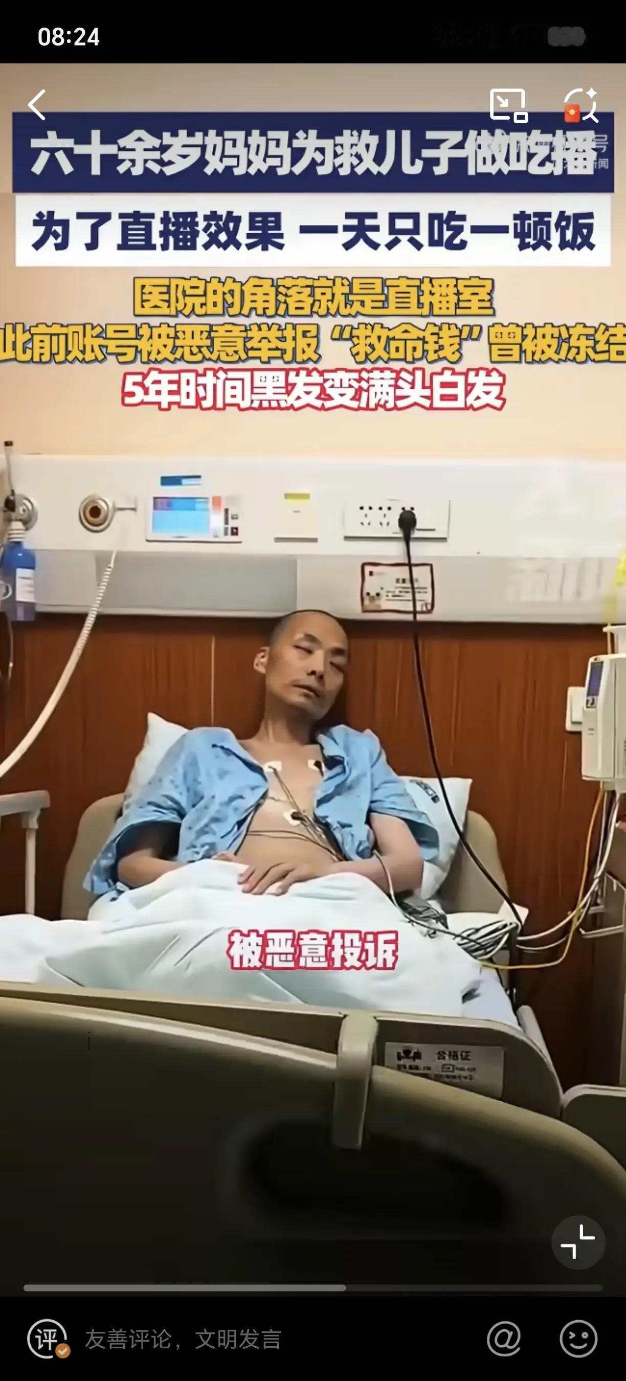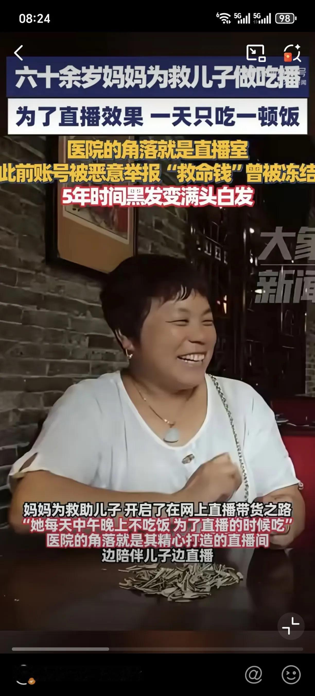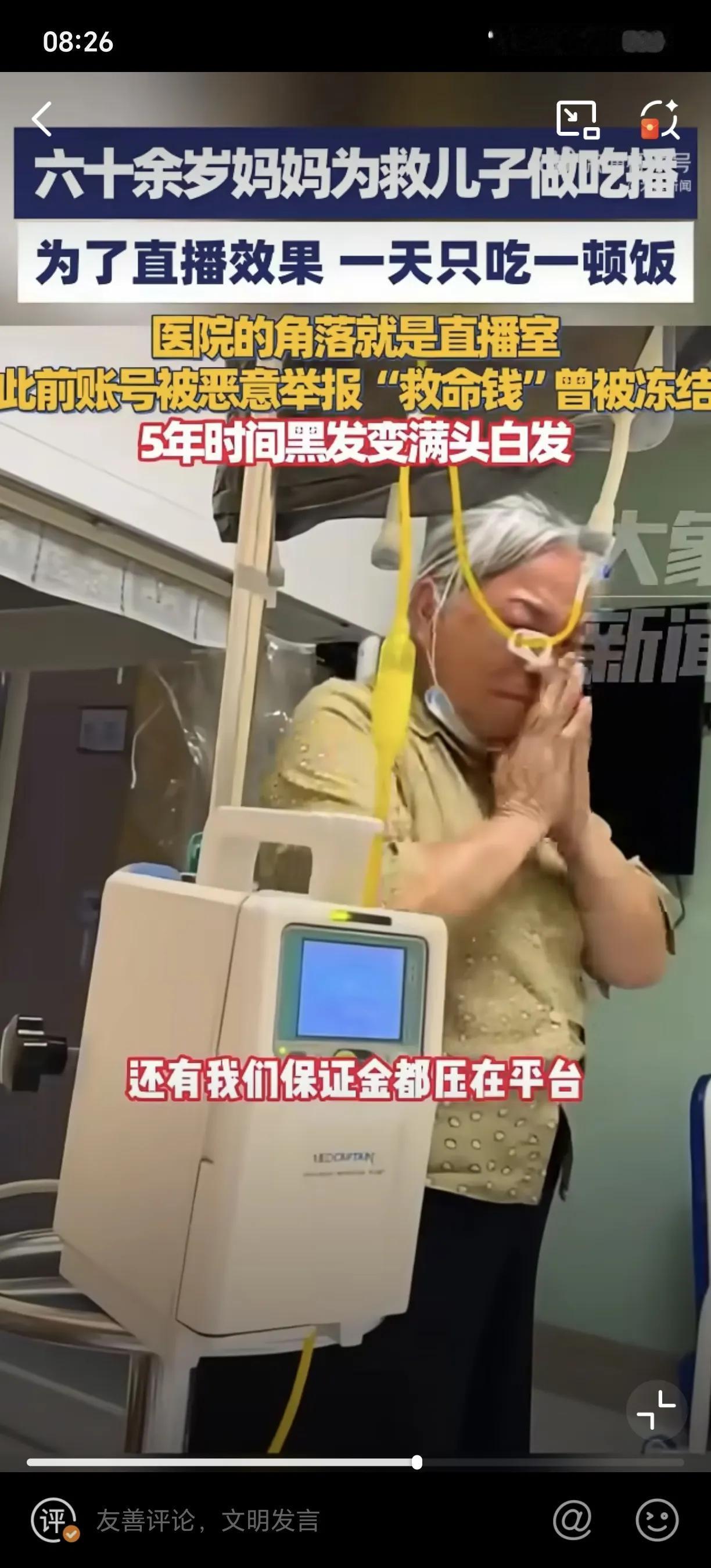 一位母亲为了给患癌儿子筹钱,在医院的一处角落里做吃播。每天中午晚上不吃饭,在直播的时候再吃。短短几年,这位妈妈一头黑发全熬成了白发。 但有些人真不是个东西,恶意举报,导致账号被封禁,救命的佣金被扣,这一刻都能想象到这位母亲该有多绝望。黑暗中好不容易投进来一丝光,却被有心之人狠狠掐灭。她只不过是想就自己的孩子而已,为什么这点希望都不给?人性 母爱 妈妈