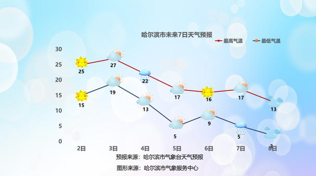 7日:大兴安岭、黑河、伊春北部阴有雨夹雪或小雪,齐齐哈尔南部、绥化南部、哈尔滨西部多云,其它地区阴有小到中雨。