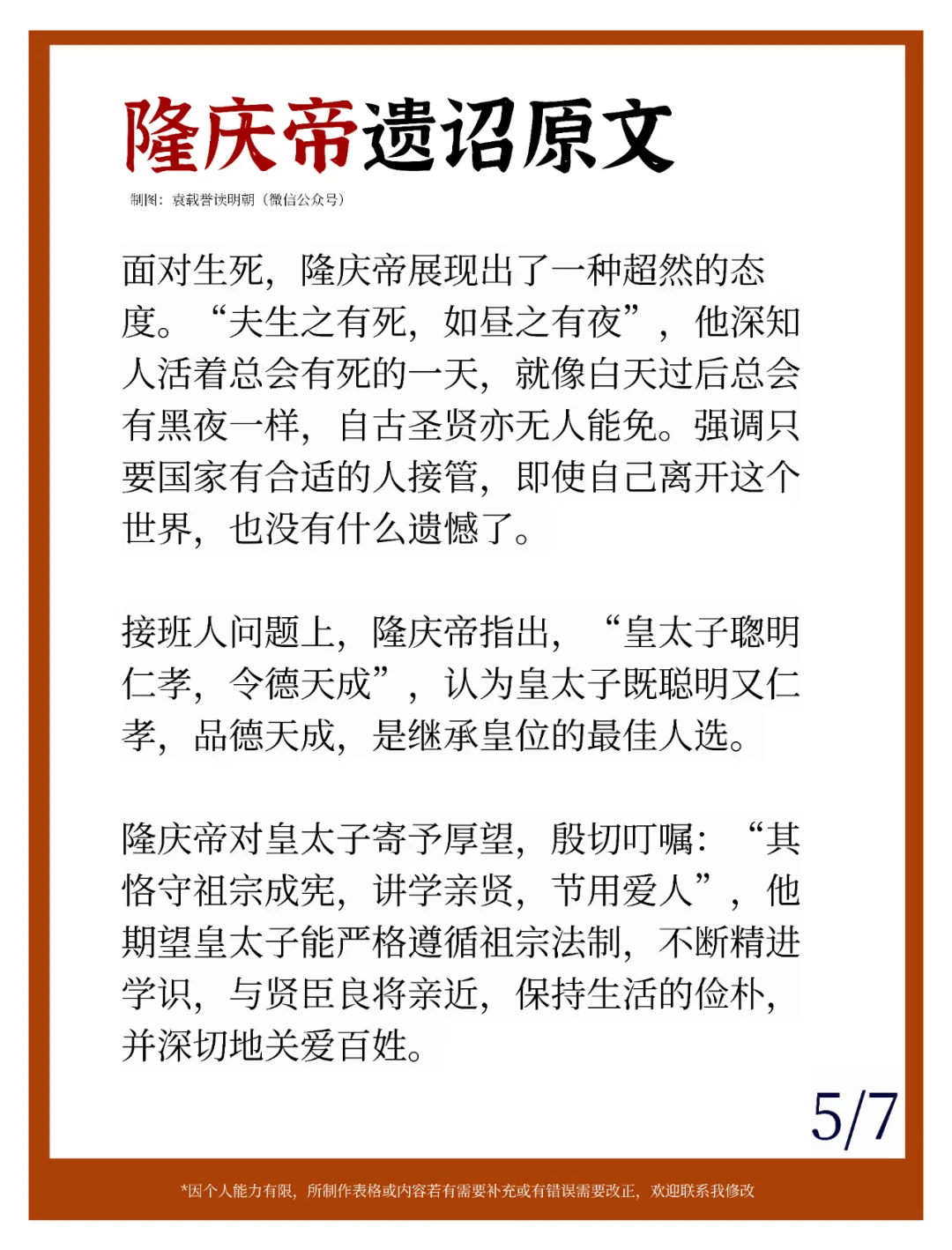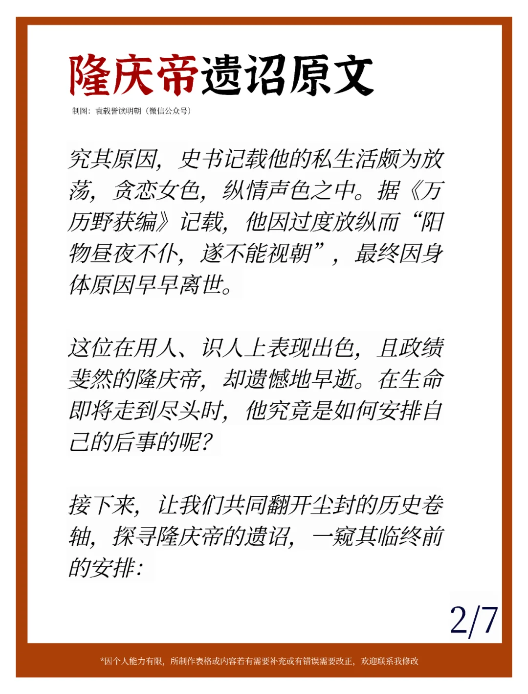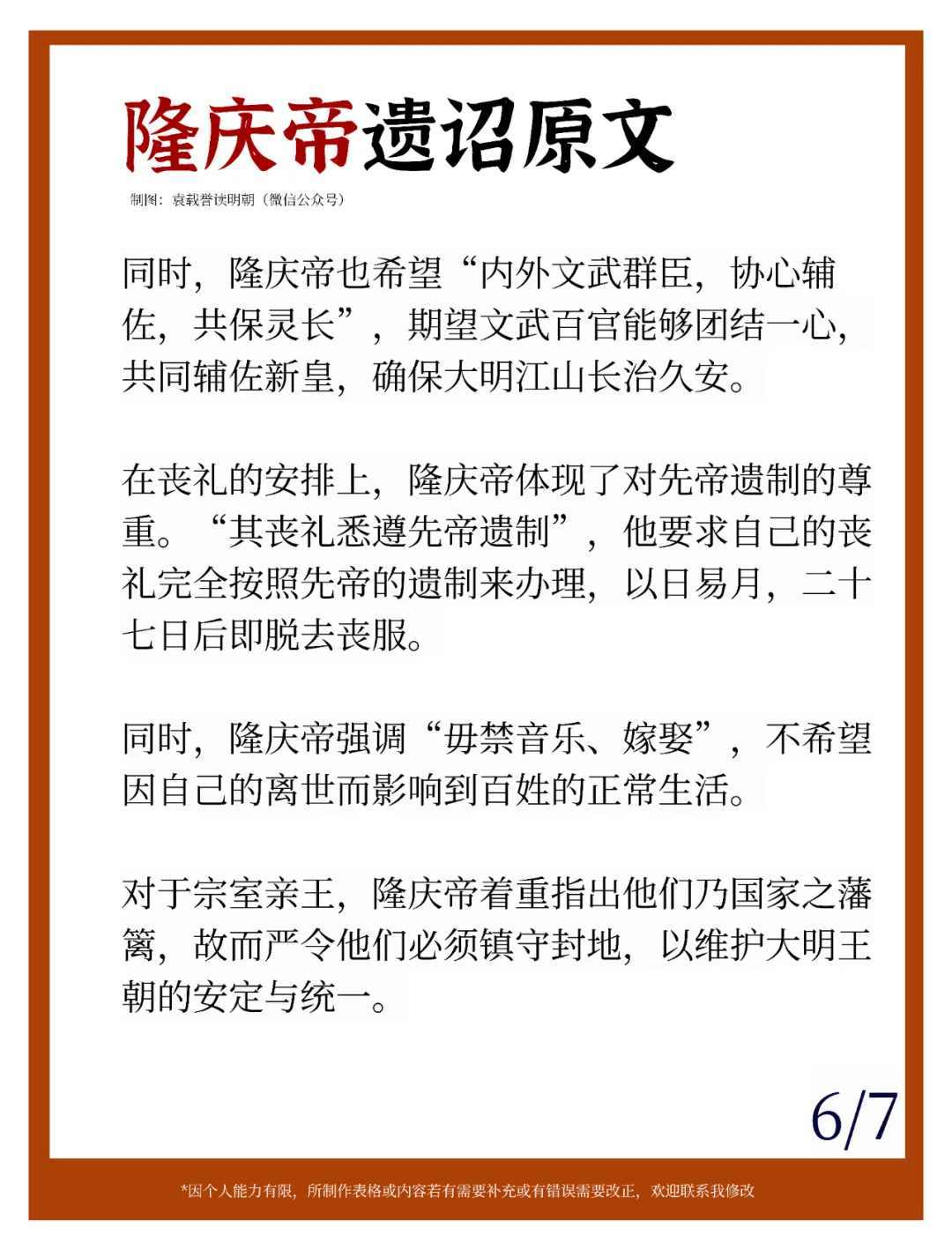 隆庆帝朱载坖,初封裕王,母亲乃康妃杜氏。嘉靖二十八年,太子朱载壡薨逝且无子,按序应立的裕王朱载坖却迟迟未得明世宗册封。直至世宗崩逝,他才得以继位,改元隆庆。 在位期间,他重用贤臣徐阶、高拱、张居正等,又倚仗谭纶、戚继光等武将,使得边防稳固,朝政清明。他推行的隆庆开关与俺答封贡政策,更是促进了经济的繁荣与稳定,为万历中兴打下了坚实基础。 然而,隆庆帝在位时间却相对短暂。隆庆六年,他便驾崩,掌权时间仅六年。 究其原因,史书记载他的私生活颇为放荡,贪恋女色,纵情声色之中。据《万历野获编》记载,他因过度放纵而“阳物昼夜不仆,遂不能视朝”,最终因身体原因早早离世。 这位在用人、识人上表现出色,且政绩斐然的隆庆帝,却遗憾地早逝。在生命即将走到尽头时,他究竟是如何安排自己的后事的呢? 接下来,让我们共同翻开尘封的历史卷轴,探寻隆庆帝的遗诏,一窥其临终前的安排: 朕以凉德缵奉丕图,君主万方,于兹六载,夙夜兢兢图惟化理,惟恐有辜先帝付托,乃今遘疾弥笃,殆不能兴。夫生之有死,如昼之有夜,自古圣贤,其孰能免?惟是维体得人,神器有主,朕即弃世,亦复何憾?皇太子聦明仁孝,令德天成,宜嗣皇帝位。 其恪守祖宗成宪,讲学亲贤,节用爱人,以绵宗社无疆之祚,内外文武群臣,协心辅佐,共保灵长。斯朕志毕矣。其丧礼悉遵先帝遗制,以日易月,二十七日释服,毋禁音乐、嫁娶,宗室亲王,藩屏是寄,不可辄离本国。各处镇守巡抚、总兵等官及都布按三司官员,严固封疆,安抚军民,不许擅离职守,闻丧之日,正于本处朝夕哭临三日,进香遣官代行。广东、广西、四川、云南、贵州及各布政司七品以下衙门,俱免进香,诏谕中外,咸使闻之。 明朝历史 明朝 历史 中国历史 历史那些事儿 历史笔记