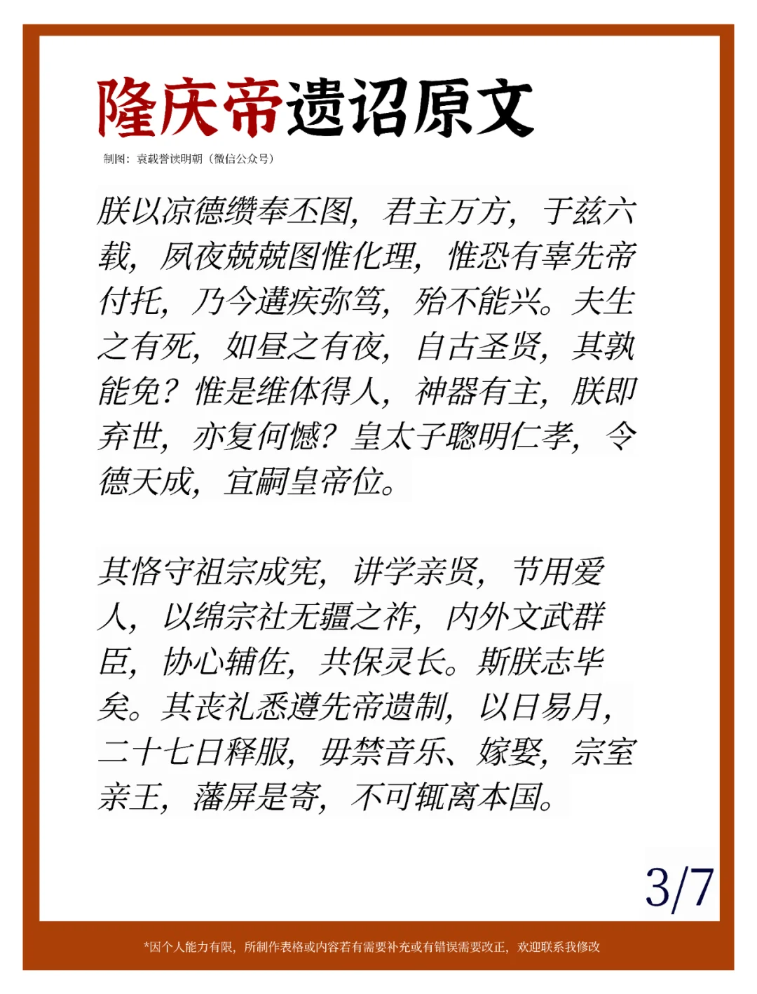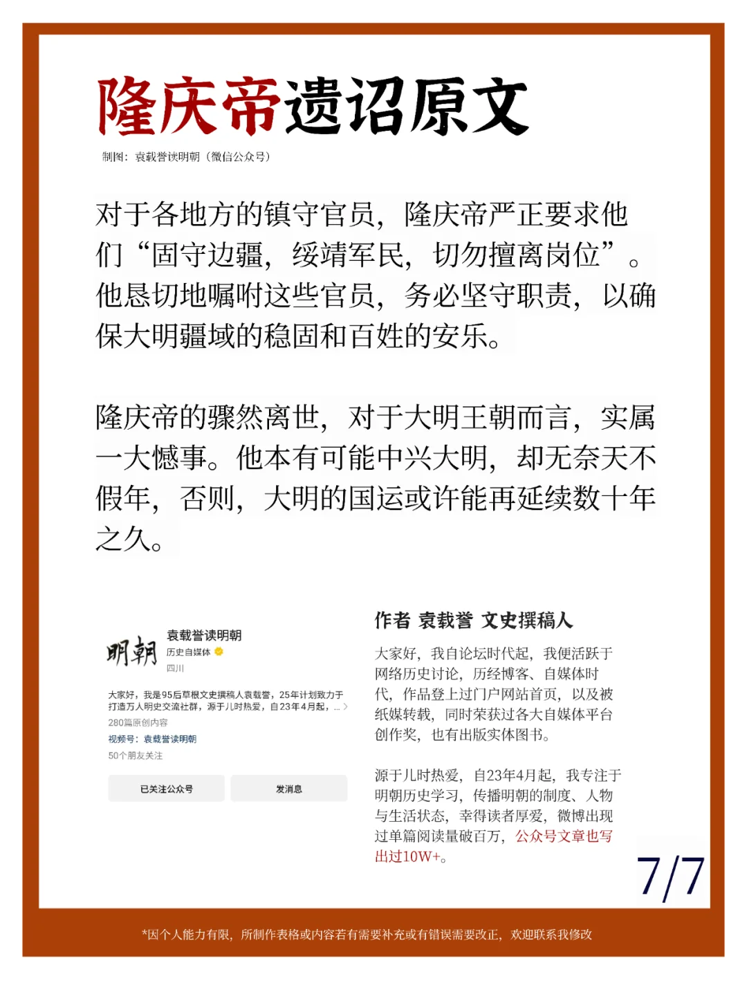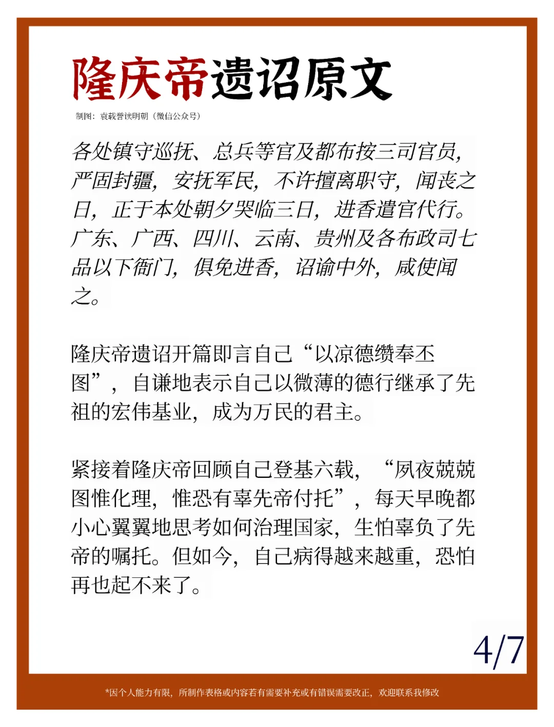 隆庆帝朱载坖,初封裕王,母亲乃康妃杜氏。嘉靖二十八年,太子朱载壡薨逝且无子,按序应立的裕王朱载坖却迟迟未得明世宗册封。直至世宗崩逝,他才得以继位,改元隆庆。 在位期间,他重用贤臣徐阶、高拱、张居正等,又倚仗谭纶、戚继光等武将,使得边防稳固,朝政清明。他推行的隆庆开关与俺答封贡政策,更是促进了经济的繁荣与稳定,为万历中兴打下了坚实基础。 然而,隆庆帝在位时间却相对短暂。隆庆六年,他便驾崩,掌权时间仅六年。 究其原因,史书记载他的私生活颇为放荡,贪恋女色,纵情声色之中。据《万历野获编》记载,他因过度放纵而“阳物昼夜不仆,遂不能视朝”,最终因身体原因早早离世。 这位在用人、识人上表现出色,且政绩斐然的隆庆帝,却遗憾地早逝。在生命即将走到尽头时,他究竟是如何安排自己的后事的呢? 接下来,让我们共同翻开尘封的历史卷轴,探寻隆庆帝的遗诏,一窥其临终前的安排: 朕以凉德缵奉丕图,君主万方,于兹六载,夙夜兢兢图惟化理,惟恐有辜先帝付托,乃今遘疾弥笃,殆不能兴。夫生之有死,如昼之有夜,自古圣贤,其孰能免?惟是维体得人,神器有主,朕即弃世,亦复何憾?皇太子聦明仁孝,令德天成,宜嗣皇帝位。 其恪守祖宗成宪,讲学亲贤,节用爱人,以绵宗社无疆之祚,内外文武群臣,协心辅佐,共保灵长。斯朕志毕矣。其丧礼悉遵先帝遗制,以日易月,二十七日释服,毋禁音乐、嫁娶,宗室亲王,藩屏是寄,不可辄离本国。各处镇守巡抚、总兵等官及都布按三司官员,严固封疆,安抚军民,不许擅离职守,闻丧之日,正于本处朝夕哭临三日,进香遣官代行。广东、广西、四川、云南、贵州及各布政司七品以下衙门,俱免进香,诏谕中外,咸使闻之。 明朝历史 明朝 历史 中国历史 历史那些事儿 历史笔记