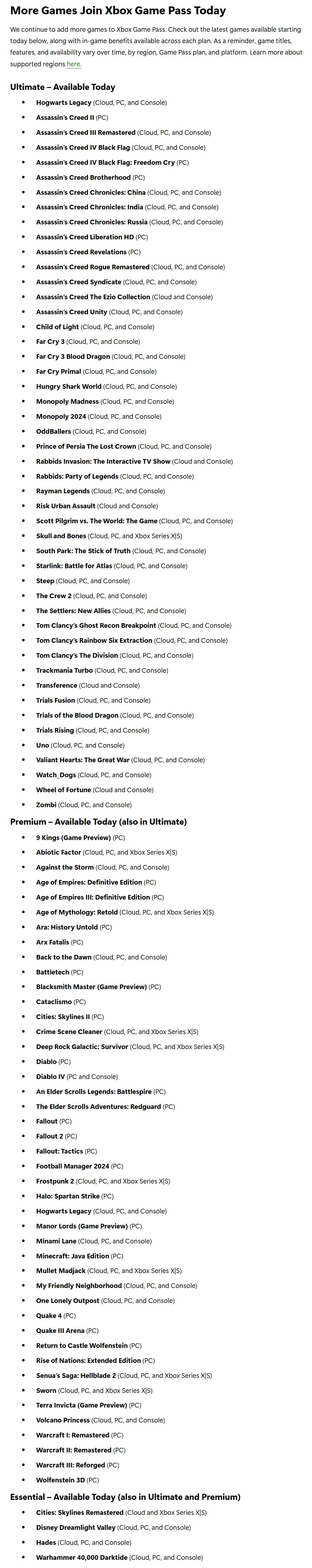 终极版:月费 29.99 美元 / 170 港币,游戏库规模超过 400 款,每年支持 75+ 款首发新作,同时附带《堡垒之夜》会员、Ubisoft+ Classics、Xbox Cloud Gaming 串流最高 1440p 等增值权益。