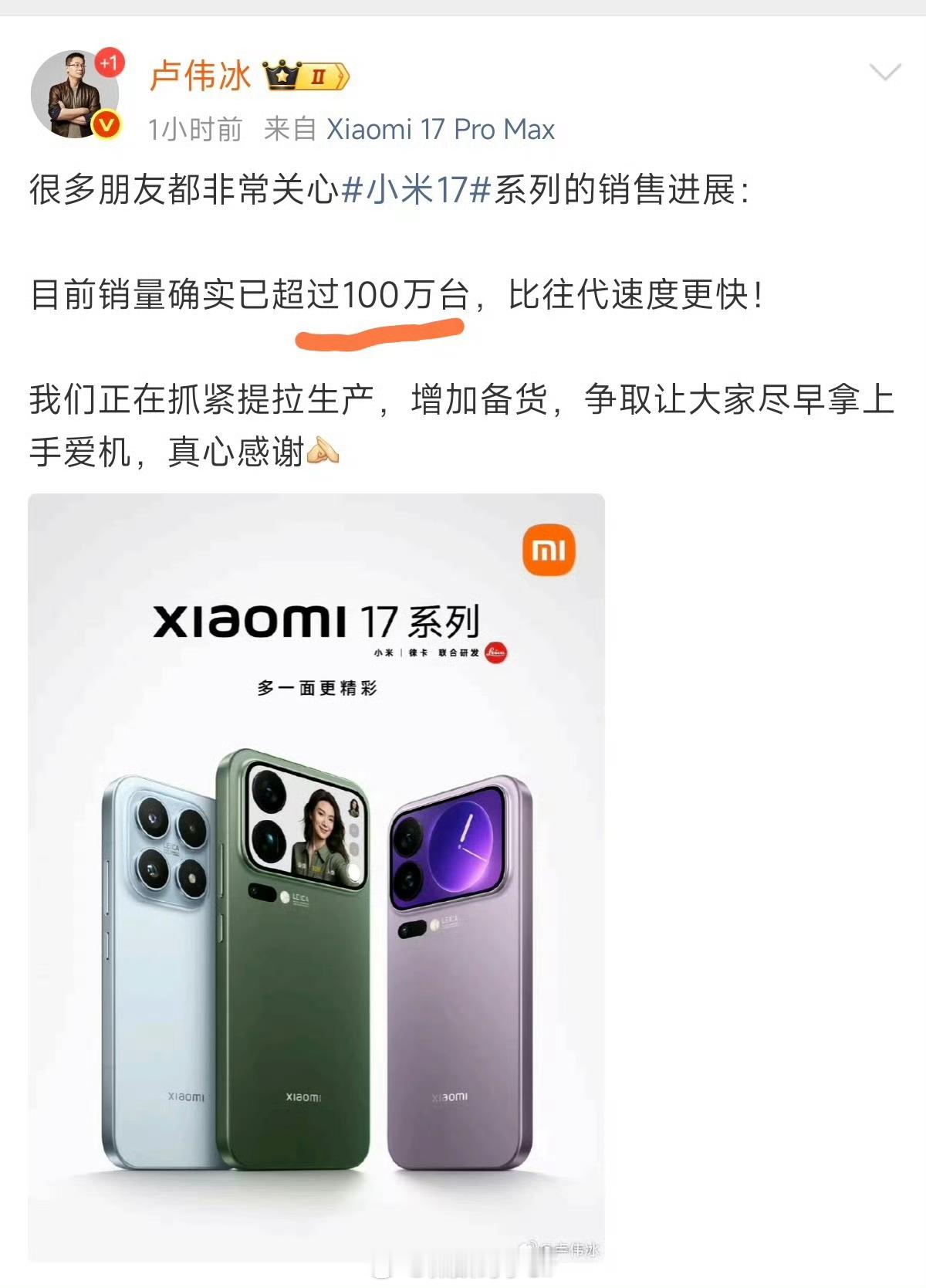 小米17系列销量破百万