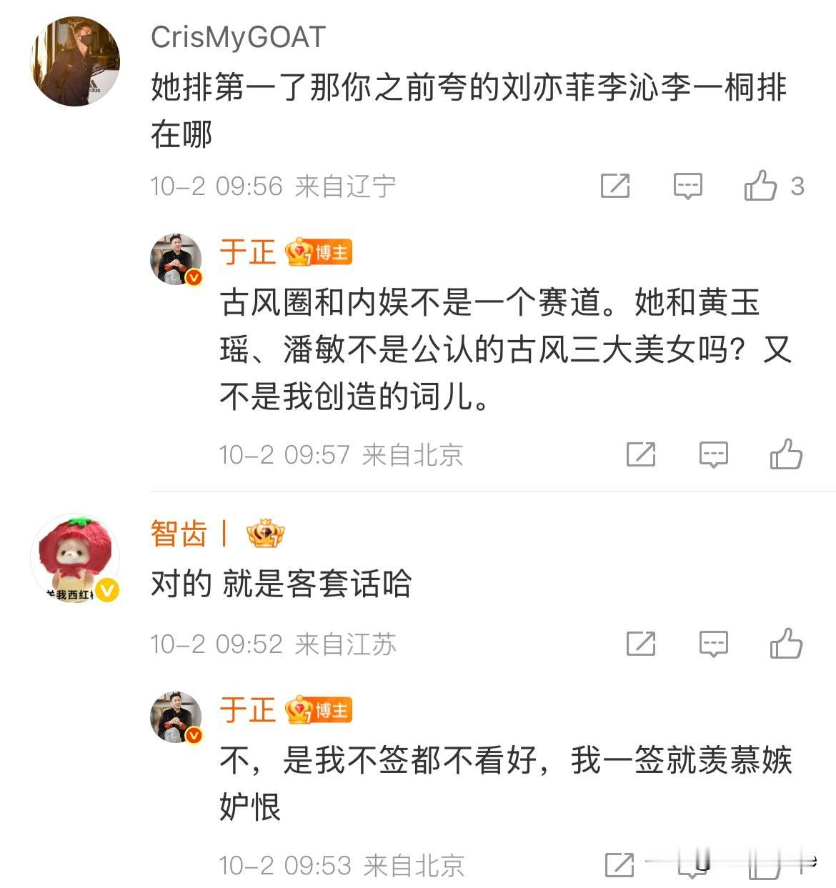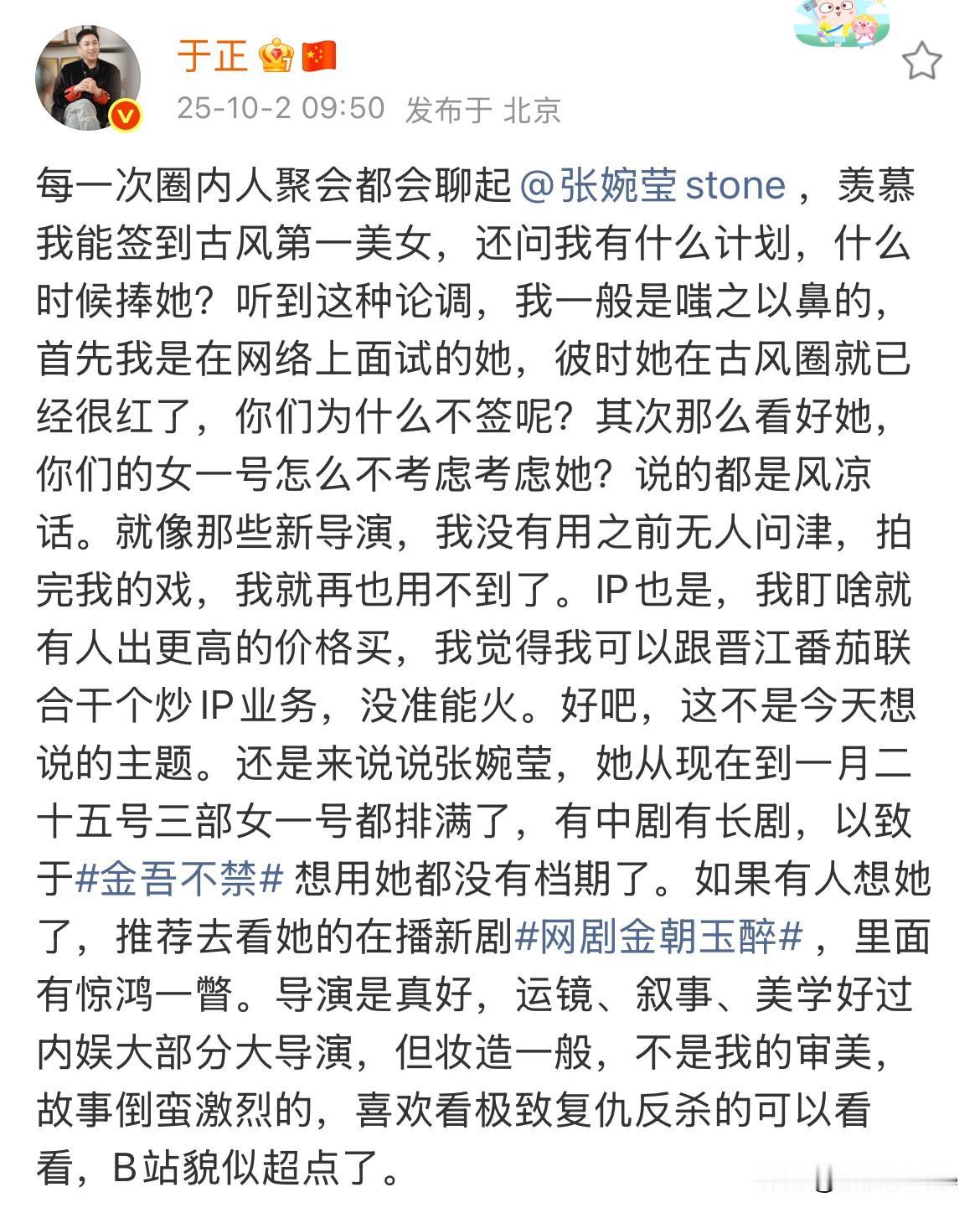 10月2日,于正又开始了他的小作文,安利自家演员,自家剧,今天是吹捧张婉莹! 有时候真的很佩服他的脸皮厚,给人抬咖的能力,借圈内人给张婉莹造势,说圈内人都嫉妒他签约了古风第一美女,这一套又一套的下来,所谓的圈内人是他的朋友吧! 不然感觉会尴尬到跟他断交,长篇大论一番后才说到重点,张婉莹有客串剧上线了! 张婉莹很漂亮,但她漂亮的没有特色,她现在快30岁了,于正捧的是25岁的赵晴,好资源轮不到她,等过几年她拍的剧多了,让观众熟识了,也到了演婆婆妈妈的年纪了……
