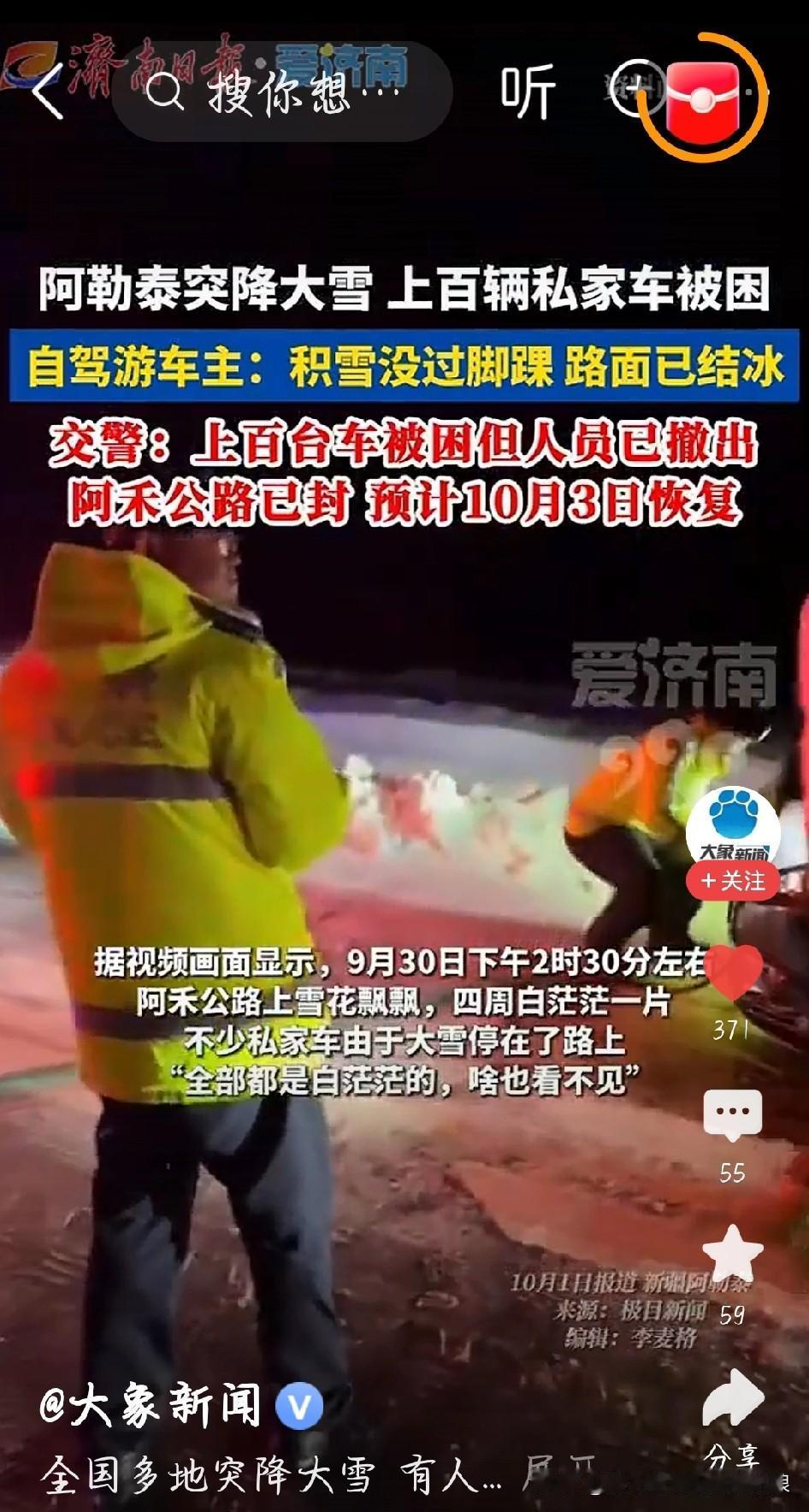 这国庆假期,不少人自驾出游直接撞上了大雪,新疆阿勒泰、青海西宁这些地方雪下得猝不及防,好多车都被困住了。 新疆阿禾公路最惊险,下午还是小雨,转眼就漫天大雪,白茫茫一片啥也看不见,积雪没过脚踝,路面全冻上了,上百辆车堵在路上动弹不得。有陕西游客说,车被撞了两次,冻得刺骨,熬到凌晨2点才到市区。 交警已经封了路,人都救出来了,但还有上百台车困在那儿,估计得等到3号才能通。 提醒下自驾的朋友,出发前一定看天气预报,高海拔地区天说变就变。真被困了别瞎下车,待车里等救援更安全,这可不是闹着玩的!多地突降大雪有人自驾被困 国庆出游 国庆假期 国庆节天气 图片截图于大象新闻