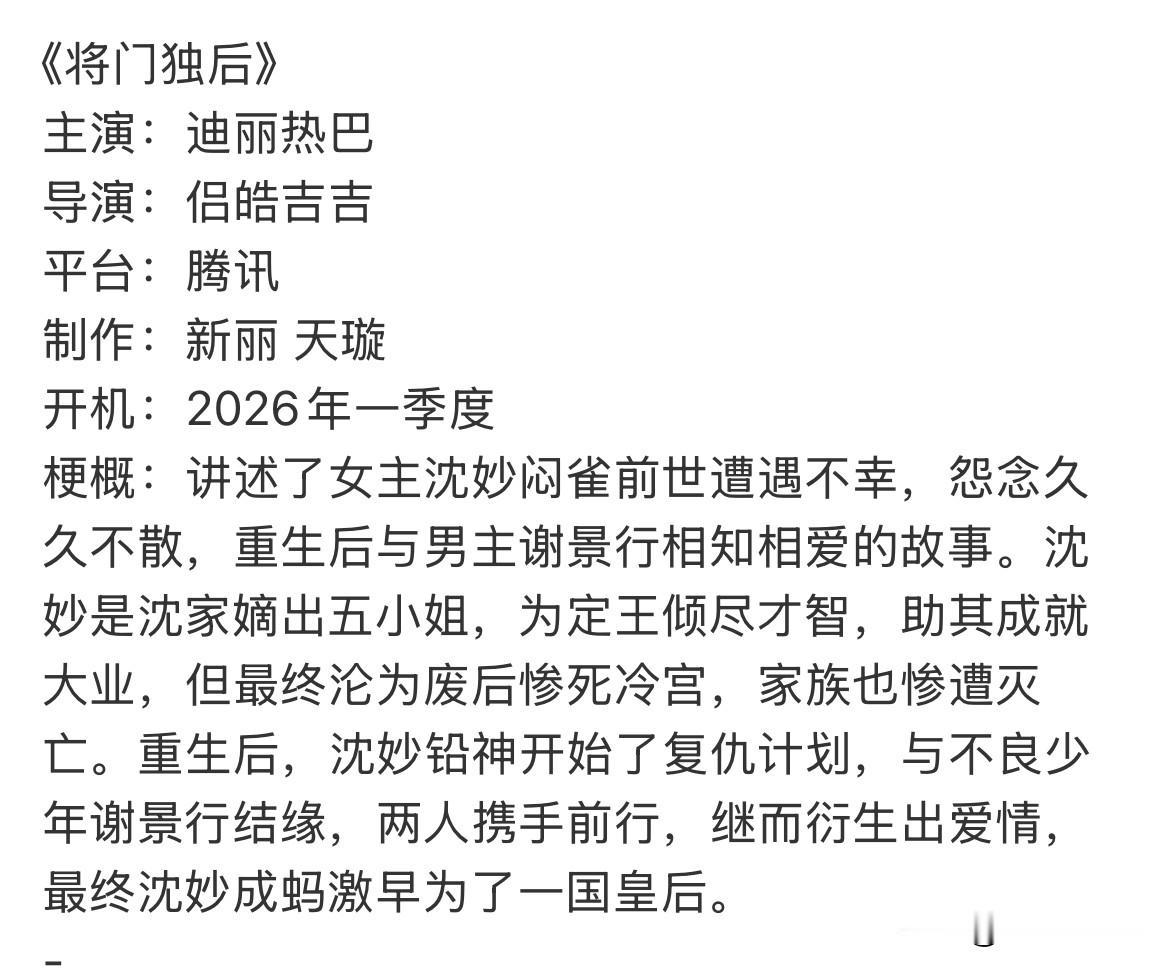 10月2日,迪丽热巴下部剧《将门毒后》! 重生,复仇,皇后文!新丽出品,这部剧真是溜了一圈内娱当红演员,结果,直到今天,男主角还是没有定下来! 今年的剧,男演员是真的难找!很多剧都因为男主角找不到而迟迟无法开机! 有演技的没资源,片方看不上,有资源的没演技,主演看不上,真是卡进循环了! 迪丽热巴目前资源不如从前,一方面是公司不给力,一方面是这两年没出成绩! 希望迪丽热巴待播剧早日开播,让内娱片方及男演员们看看,姐的实力!
