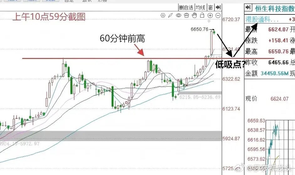 从恒生科技指数60分钟k线图我们应该能够发现,今天早盘的第1个小时大阳线拉升,而前面很多个小时都是小k线的走势,所以今天早盘的第1个小时已经进入到情绪的高潮期。而根据经验来看,一旦到达情绪的高潮期,那么有可能就是短线的小拐点。所以接下来我们不妨耐心等待恒生科技指数回踩60分钟级别前期高点的时候,到时候再看看是不是有合适的低吸点。
