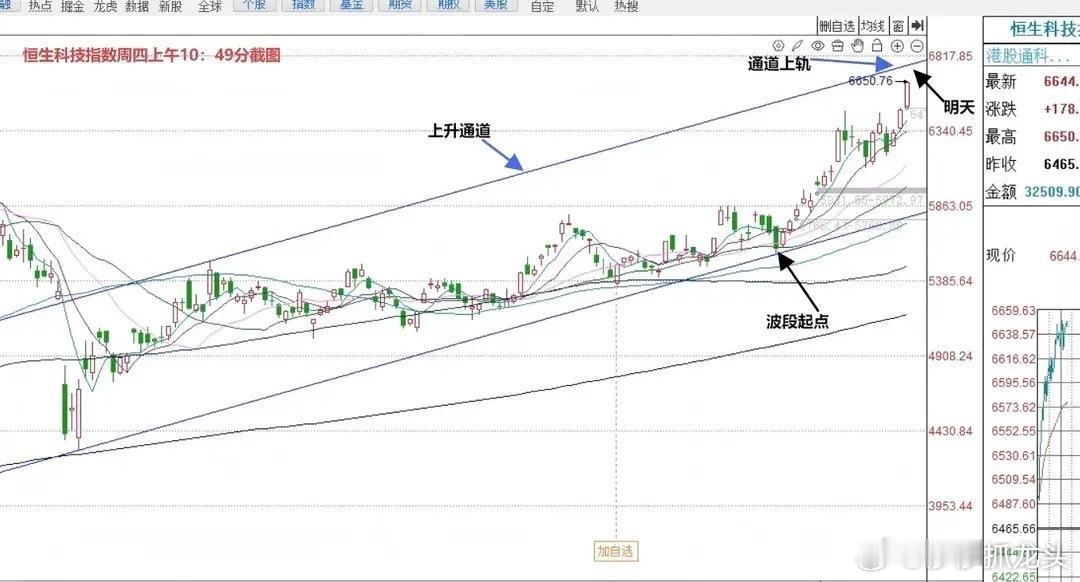 但是,从图一当中我们也能够发现,如果明天指数再上涨的话,很快就会到达上升通道上轨的压力位。恒生科技指数上升通道上轨的压力点大概在6750点附近。而目前恒生科技指数的点位是6622点左右。