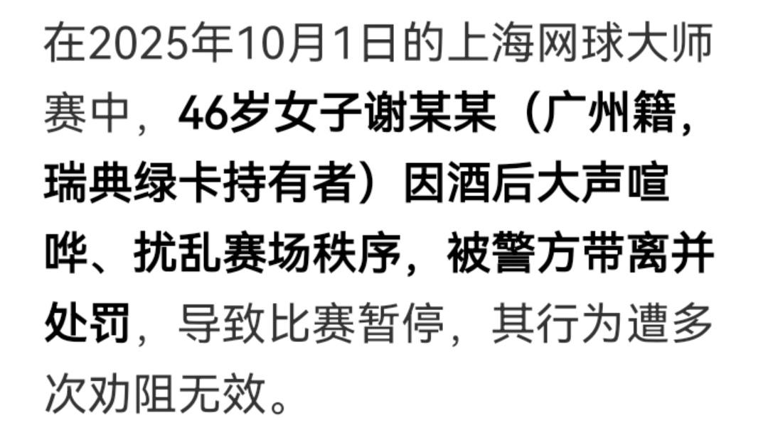 上海网球赛场上绿卡女子咆哮停赛,外国绿卡的优越感让女子展现的很到位! 从网上的信息发现,此女子谢X为广州籍,持有瑞典绿卡,老公是内蒙利乐包装公司经理,蒙牛,伊利的供应商。 谢X是酒后在赛场上咆哮,从视频分析,此人不是醉酒,是耍酒疯,但凡饮酒者都知道,耍酒疯的心里清楚明白着呢,她是借酒劲闹情绪。 赛场安保劝不了,报警了,面对警察叔叔的劝导,女子不但不配合,还拿护照和身份证炫耀,各种手势和动作明显是在挑衅,展现绿卡的优越感。 绿卡本身只是证明你从哪里来,但她对绿卡的优越感是从什么时候,从哪里来的不得不思考,以洋为尊,以洋为美的根源并不是来自于她自身,和外因关系很大。 对此类事件,应高度重视,必须要立规矩! 突然想起,美国人怎么处理此事?美国是个移民国家,全世界的人都有,在移民管理模式上是很有体会和经验的,师夷长技以制夷,K签的实施,大量的外籍人员流动,在管理上应该有所革新。上海外国人 上海网球公开赛 上海网球